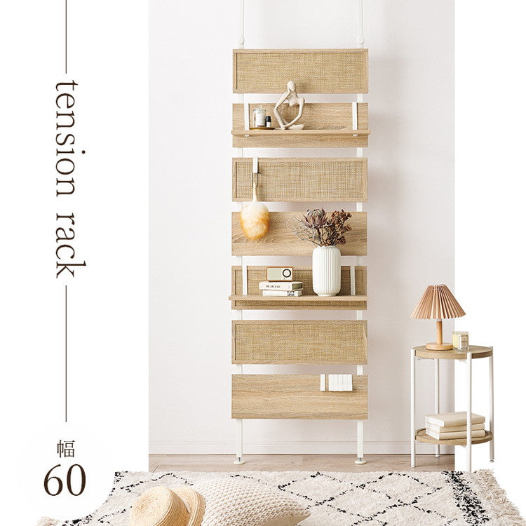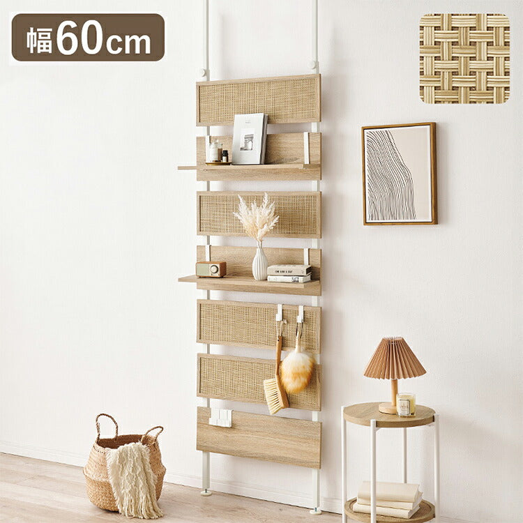 ラタン調 突っ張り棚 幅60 つっぱり ラック おしゃれ 突張り 収納 棚 パーテーション 間仕切り ウォールシェルフ 壁 引っ掛け 引掛け 高さ調整 調節 段差 伸縮 木製 壁面収納 韓国インテリア(代引不可)