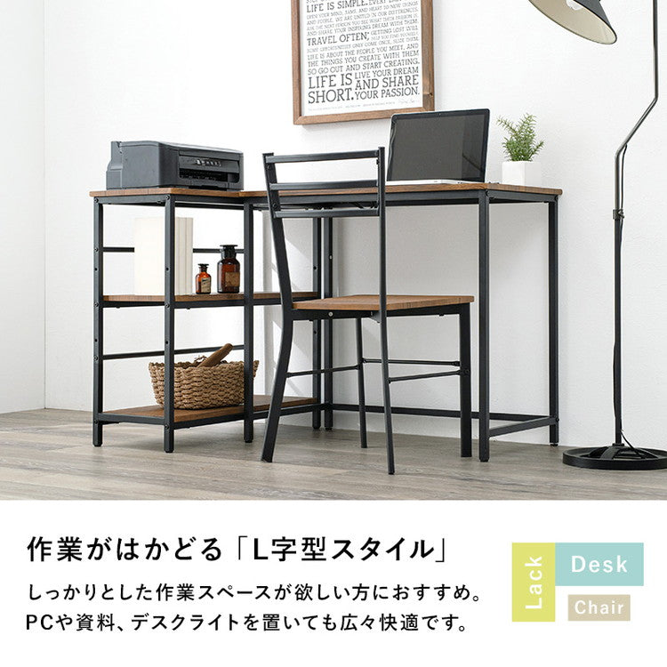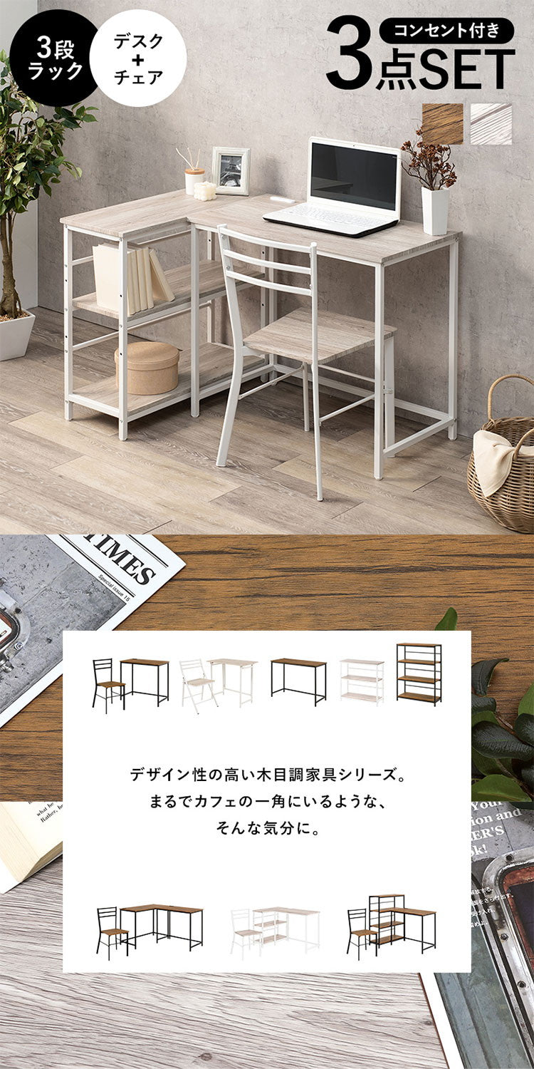 デスク ラック チェア 3点セット コンセント付き L字デスク 棚付き デスク L字 机 作業机 作業デスク 椅子 イス チェア プリンターラック プリンター台 北欧 おしゃれ(代引不可)