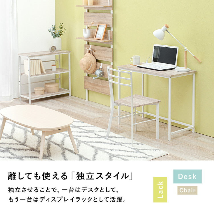 デスク・チェア・3段ラックの3点セット。デスクとラックは高さが同じなので広い作業スペースとして使ったり、別々にシリーズ家具としてコーディネートしたりとレイアウトを変えられます。