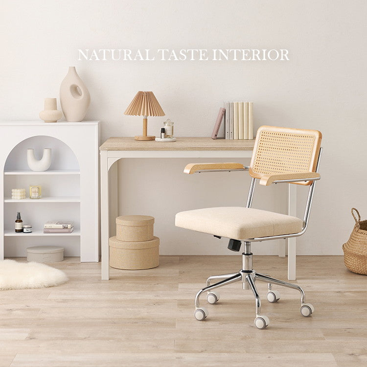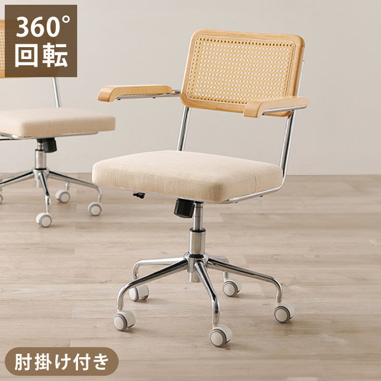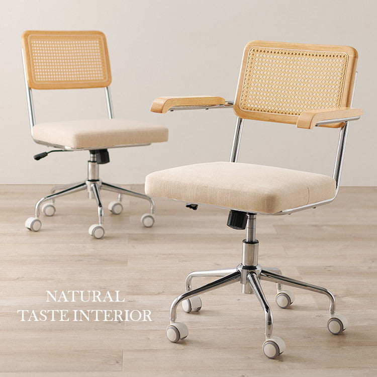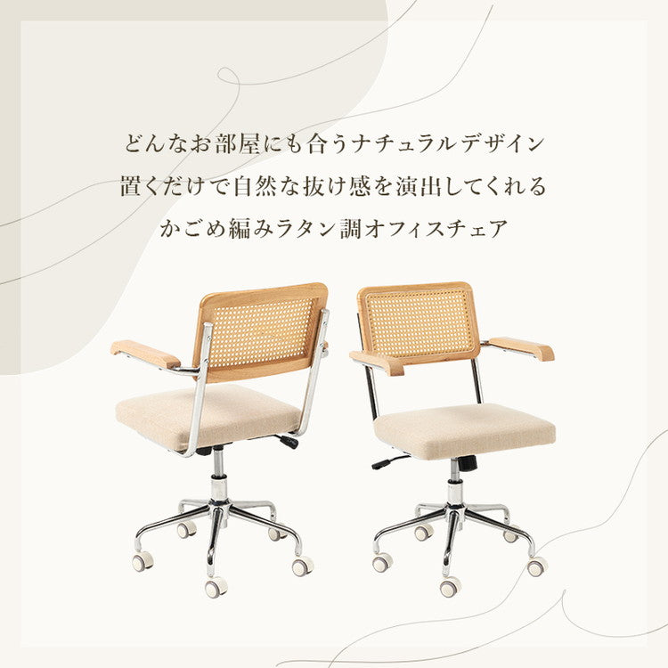 置くだけで自然な抜け感を演出するナチュラルテイストのラタン調オフィスチェア。肘掛け付き