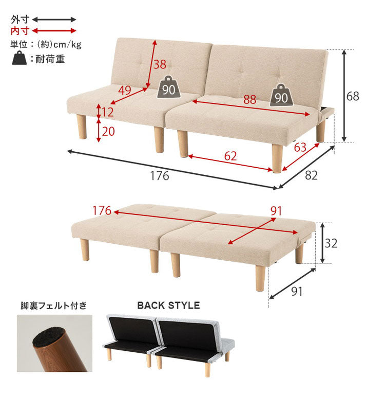(約)幅176×奥行82~91×高さ68~32×座面高32cm