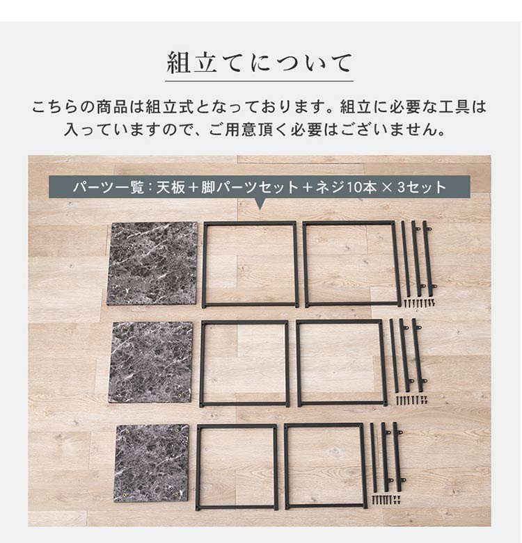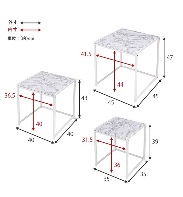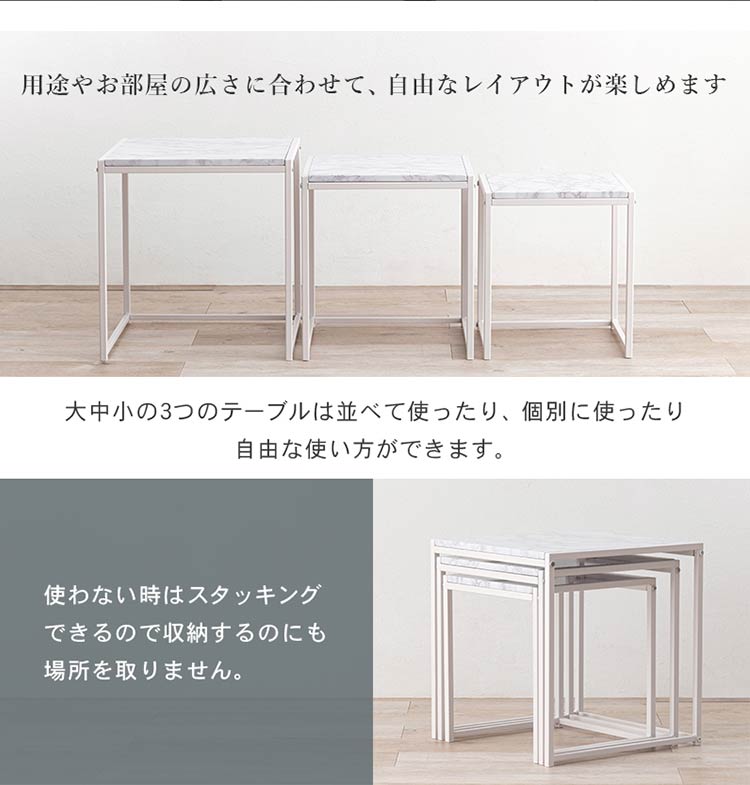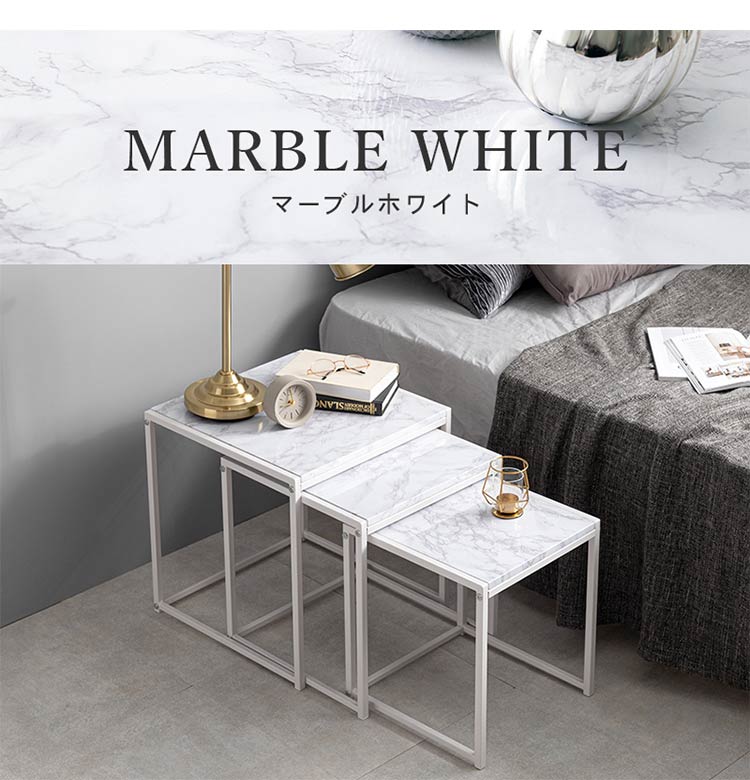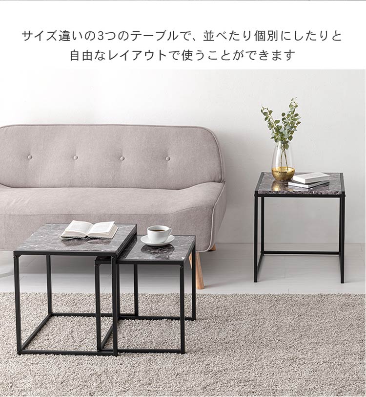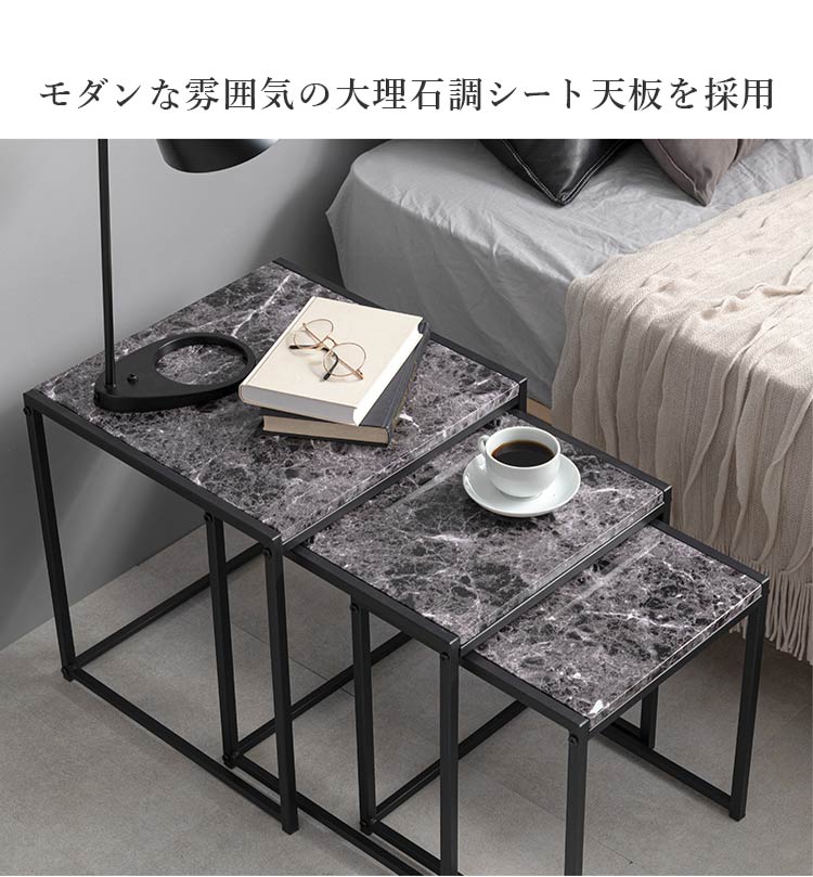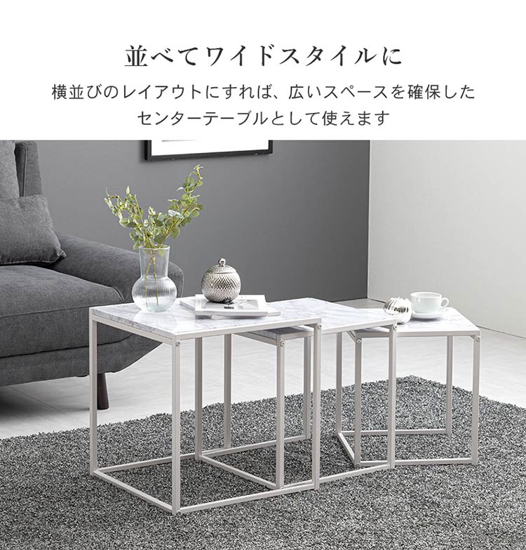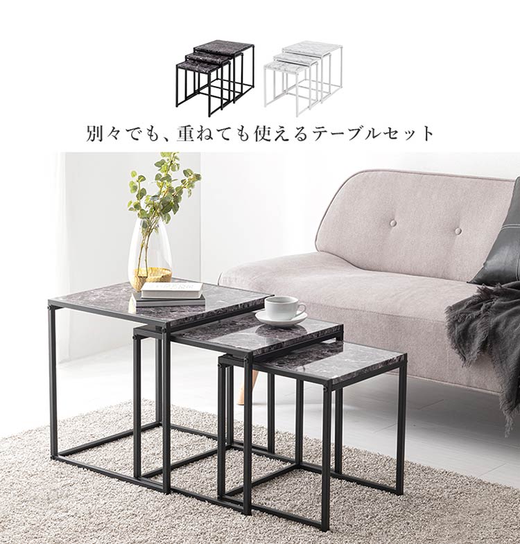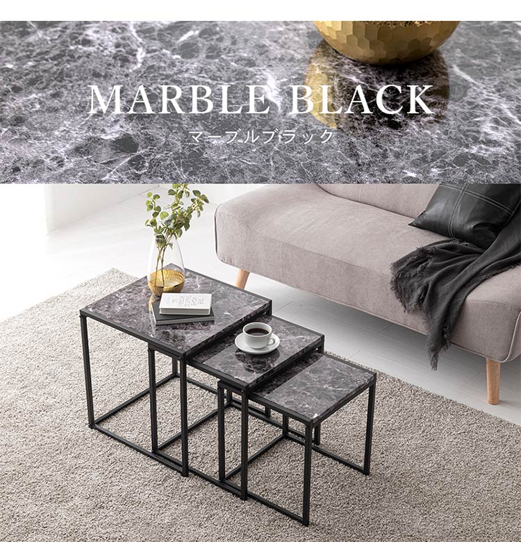 モダンな雰囲気の大理石調天板を使用したネストテーブル、角型3個セットです。