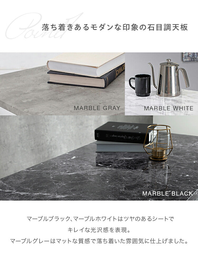 マーブルホワイト、マーブルブラックの天板は光沢のある素材を使用しているため艶がありますが、鏡面仕上げではありません。