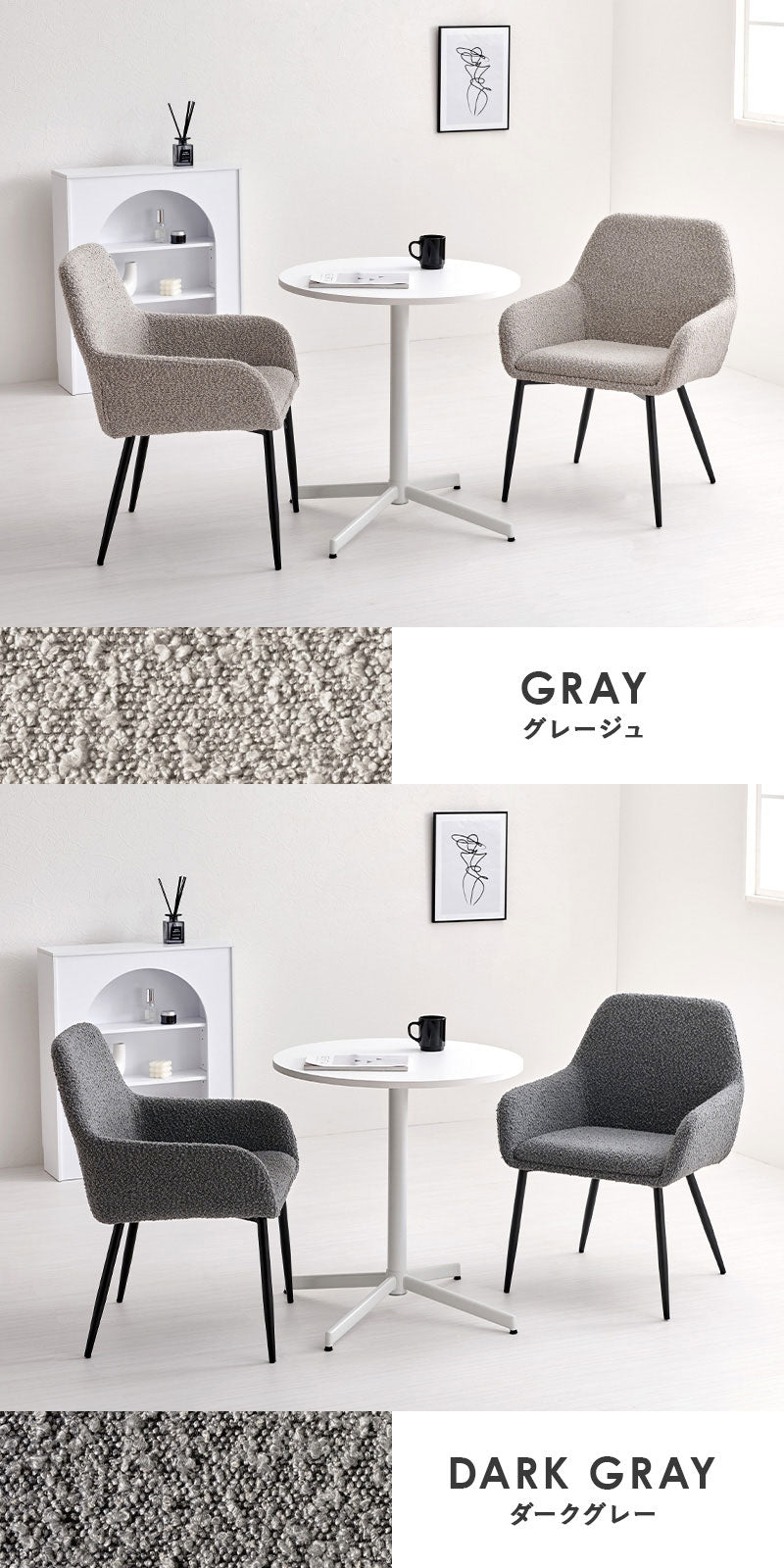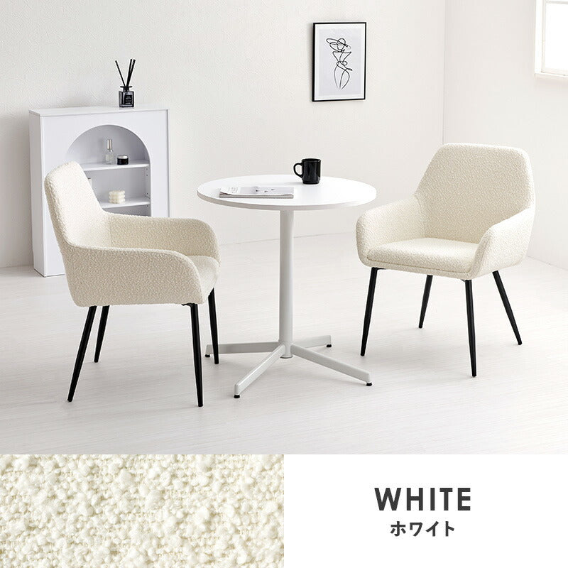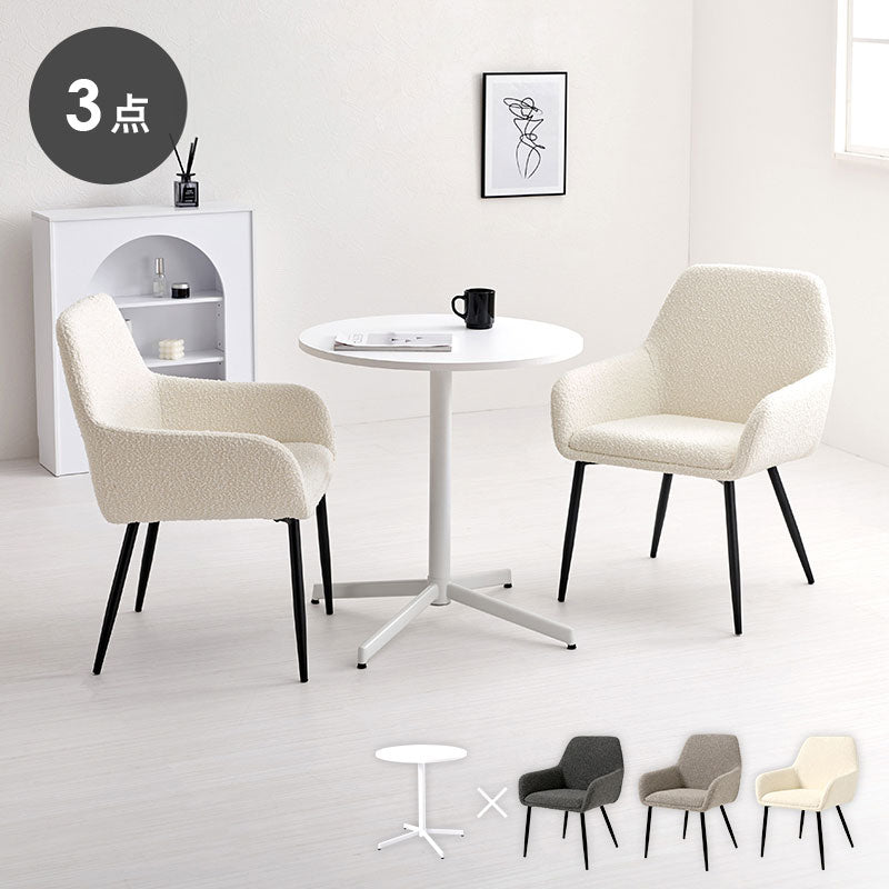 ぽこぽことした質感が特徴的なブークレ生地のチェアとホワイトカフェテーブルを合わせた、モダンでありながら温かみのある雰囲気の3点セット。