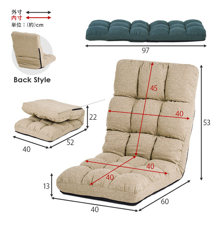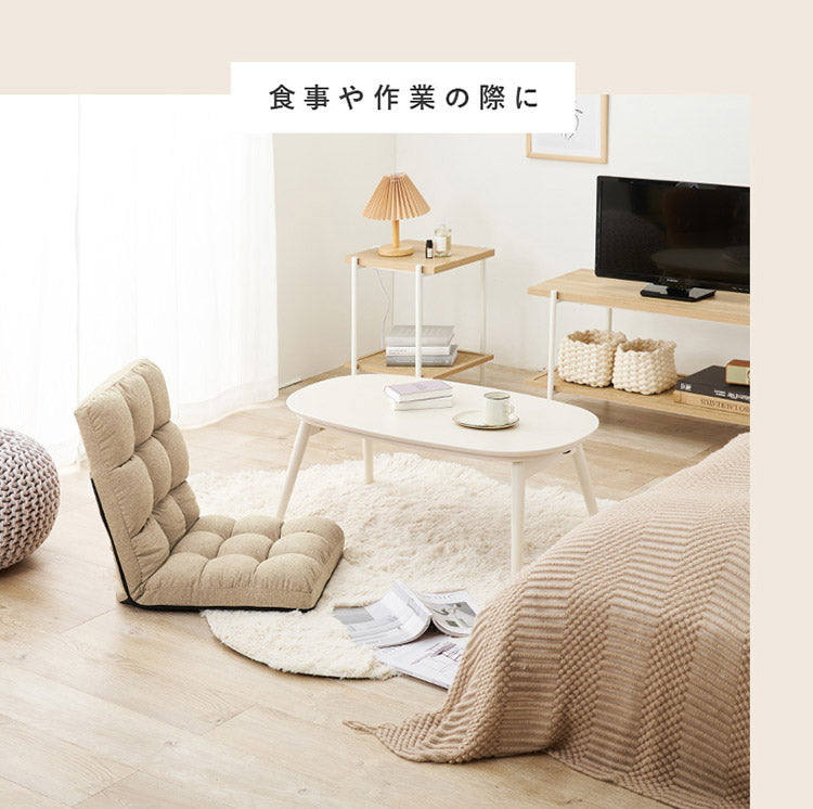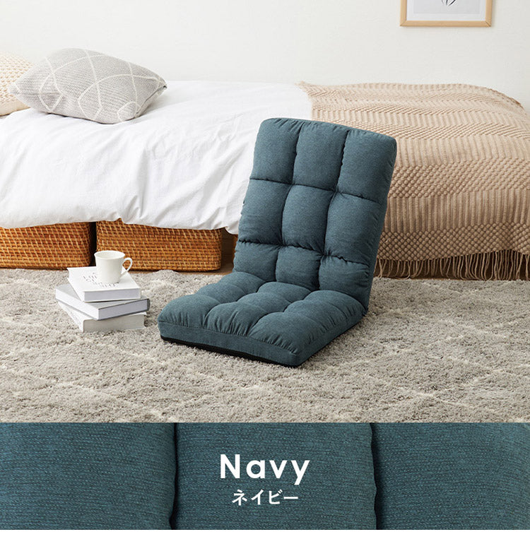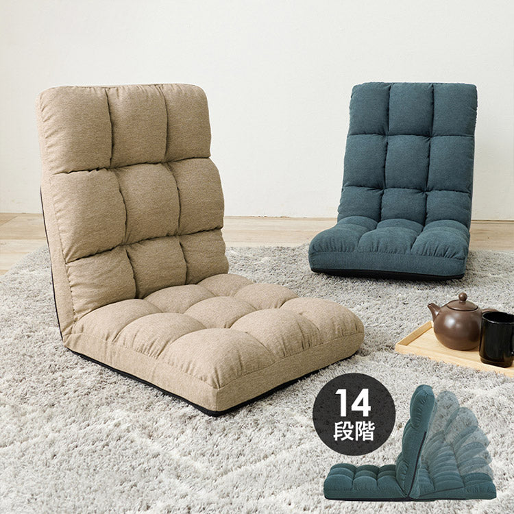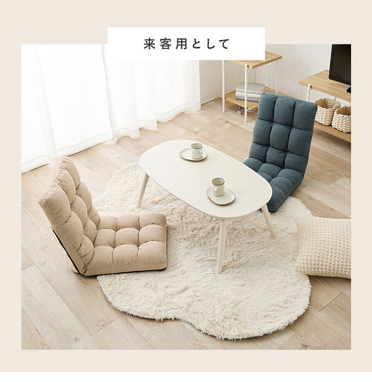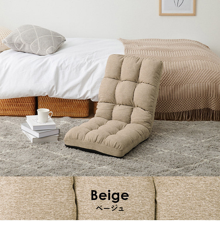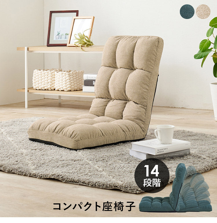 狭いお部屋でもかさばらないコンパクトな座椅子。背もたれは14段階リクライニング可能です。