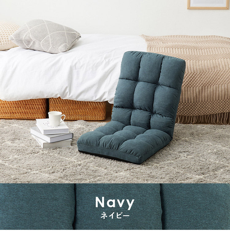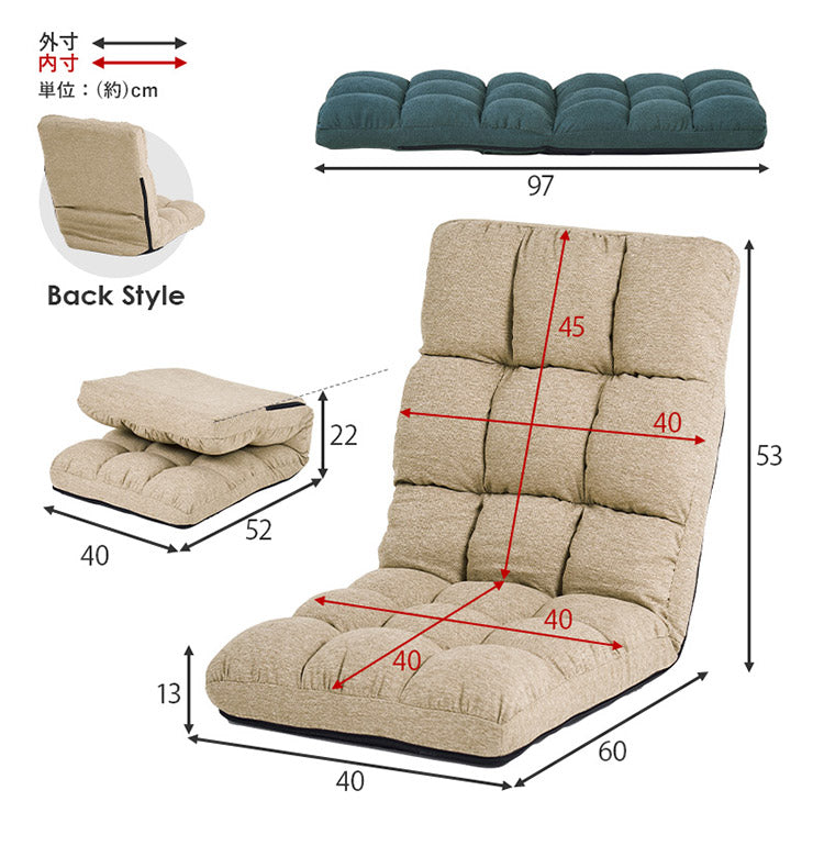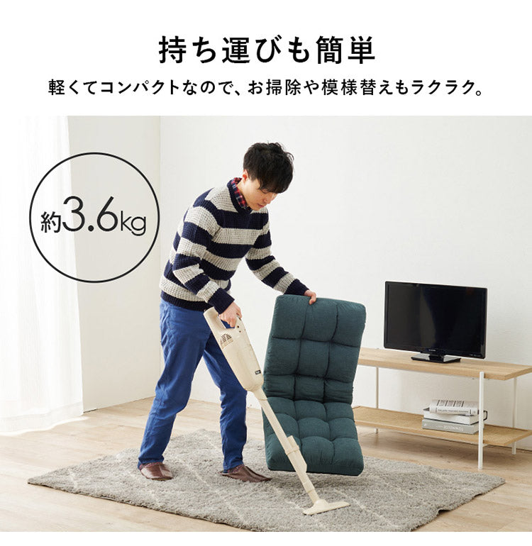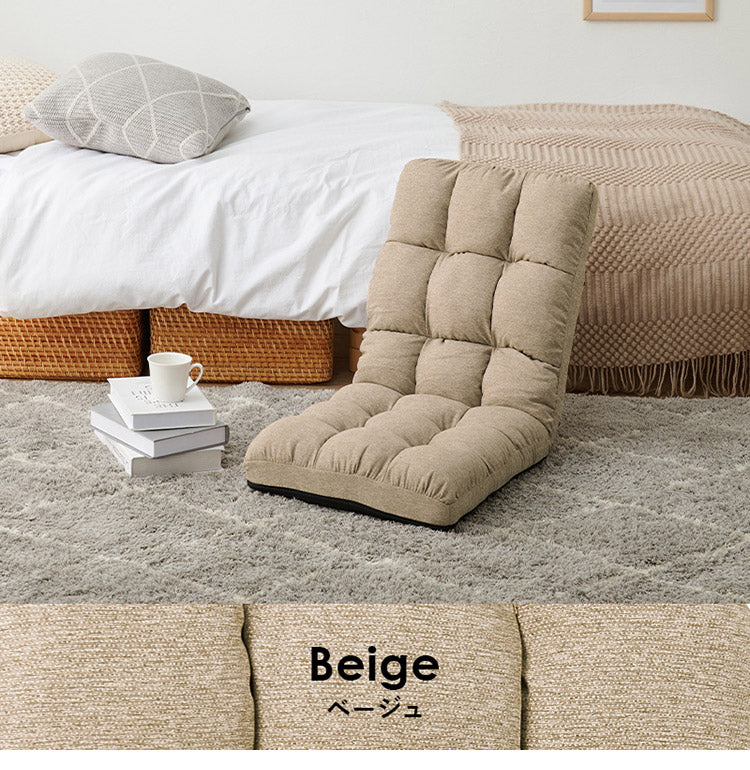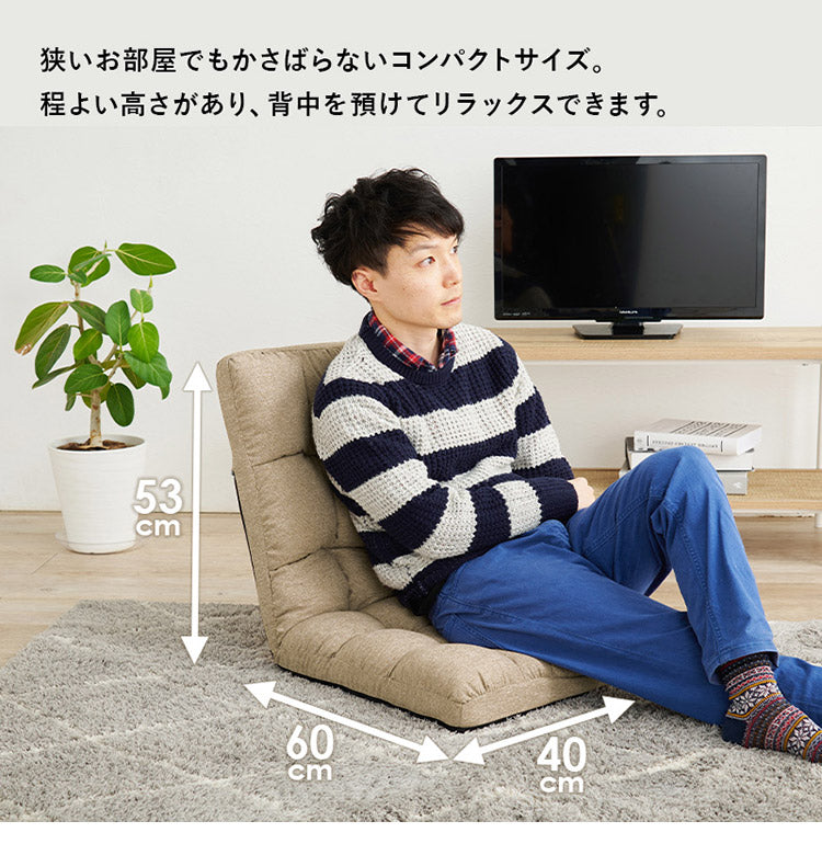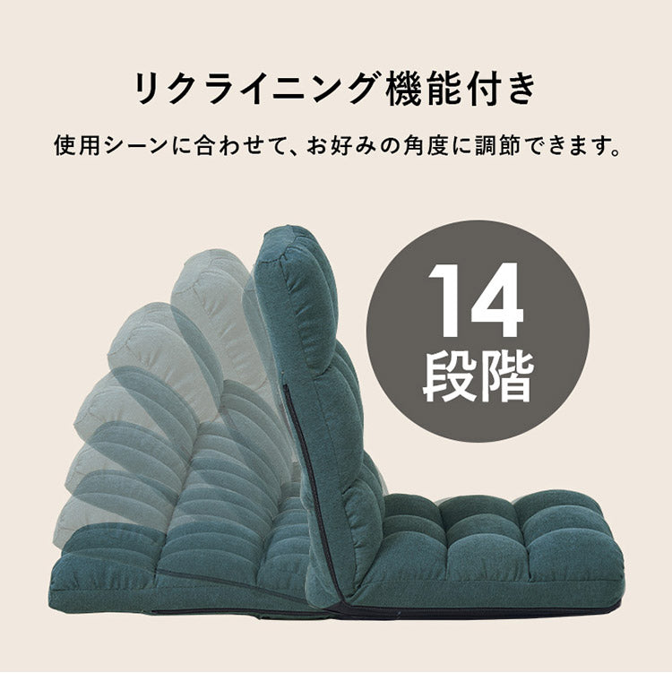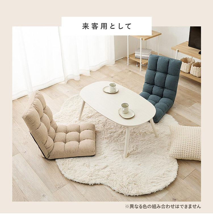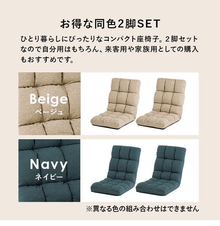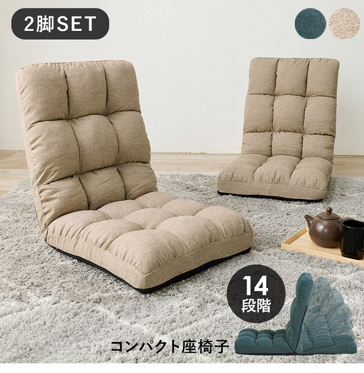 狭いお部屋でもかさばらないコンパクトな座椅子。背もたれは14段階リクライニング可能です。来客用としてもおすすめな同色2点セット