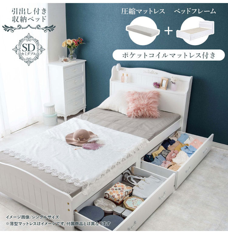 姫系 引出し収納付き ベッド ポケットコイルマットレス付き 2点セット セミダブル ホワイト 白 エレガント 収納付き チェストベッド 棚付き 宮棚 2口コンセント ベッドフレーム すのこベッド(代引不可)