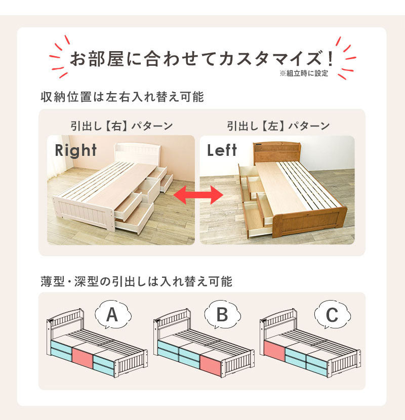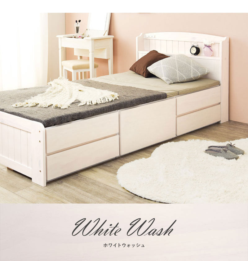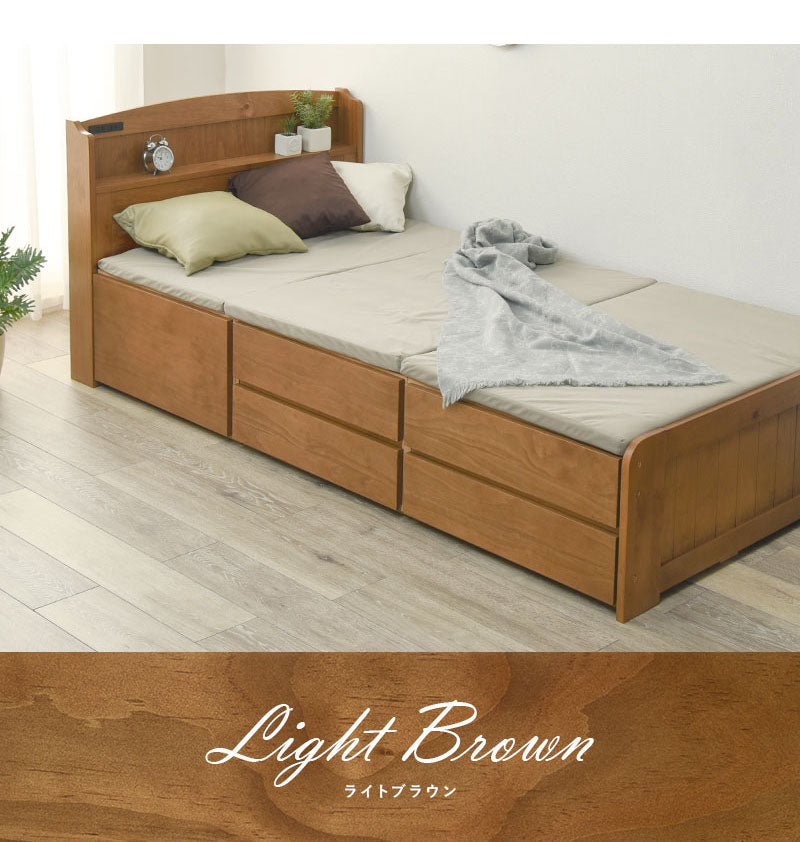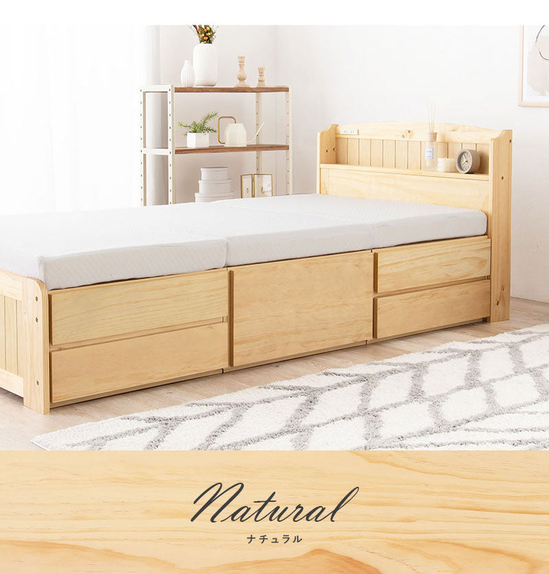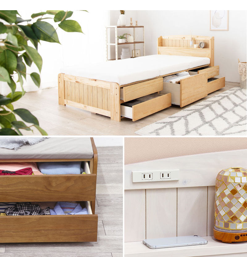 天然木、ベッド、シングル、収納、ベッドフレーム、棚、引き出し、コンセント、宮棚、宮付き、北欧、おしゃれ