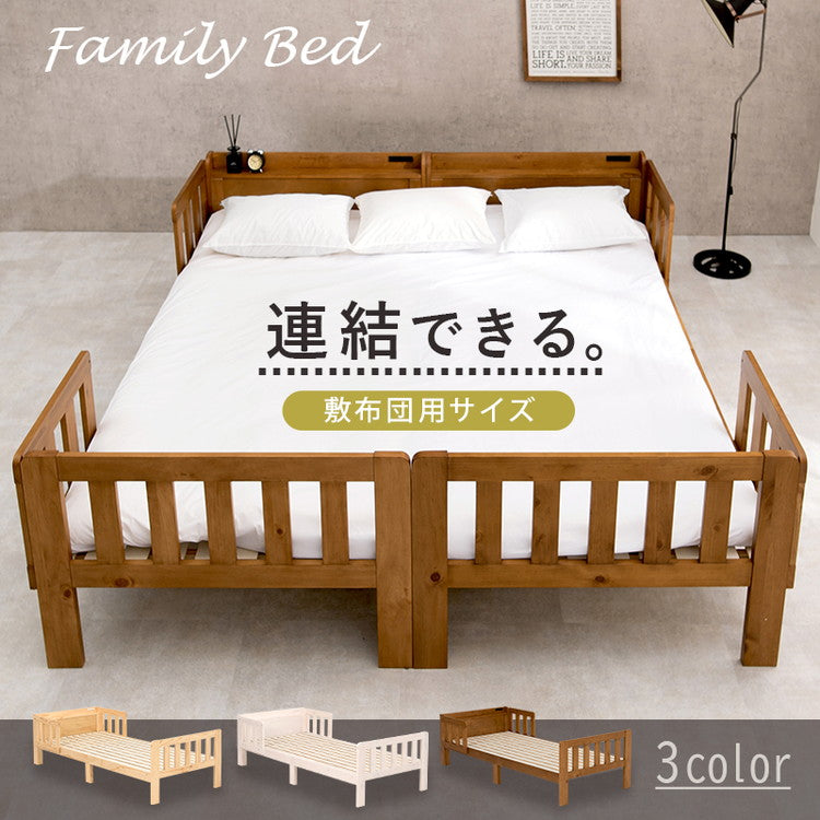 1台だとベッドガード付きの1人用ベッド、2台を連結すると家族で広々使える大きなキングサイズベッドに。敷布団が使えるロングサイズで、スマホも置ける宮棚付き