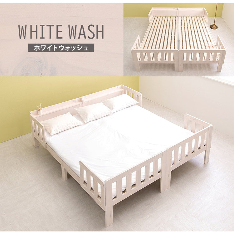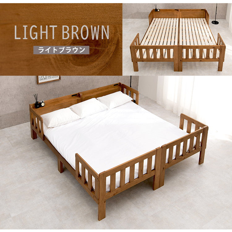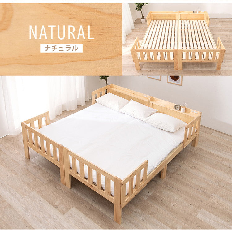 キングサイズベッド 連結できるシングルベッド×2台セット 敷布団用サイズ コンセント 棚付き ファミリーベッド キング 耐荷重200kg 天然木 ベッドガード ベッドフレーム(代引不可)