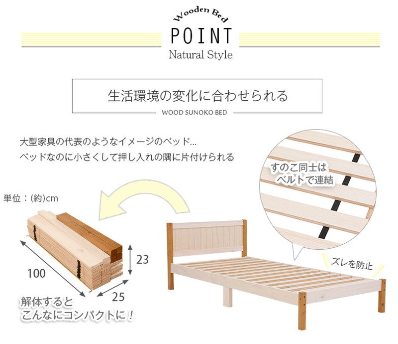コンパクトに分解できる木製シングルベッド。