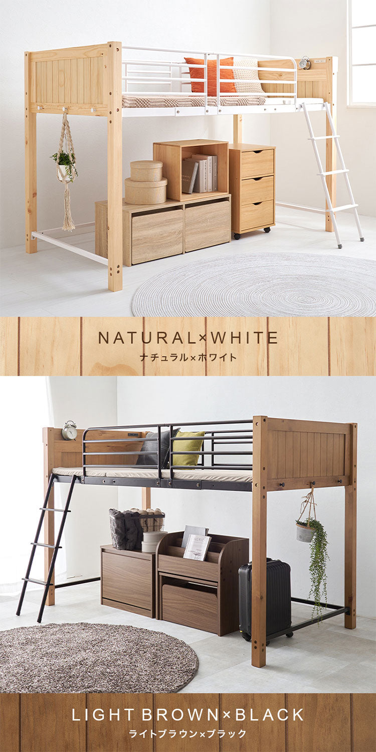 ロフトベッド 天然木 棚付き コンセント付き シングル パイプベッド ベッドガード 高さ137cm ロータイプ ベッドフレーム(代引不可)