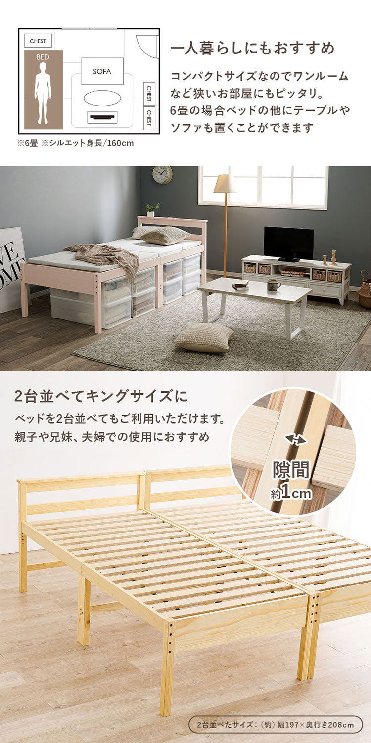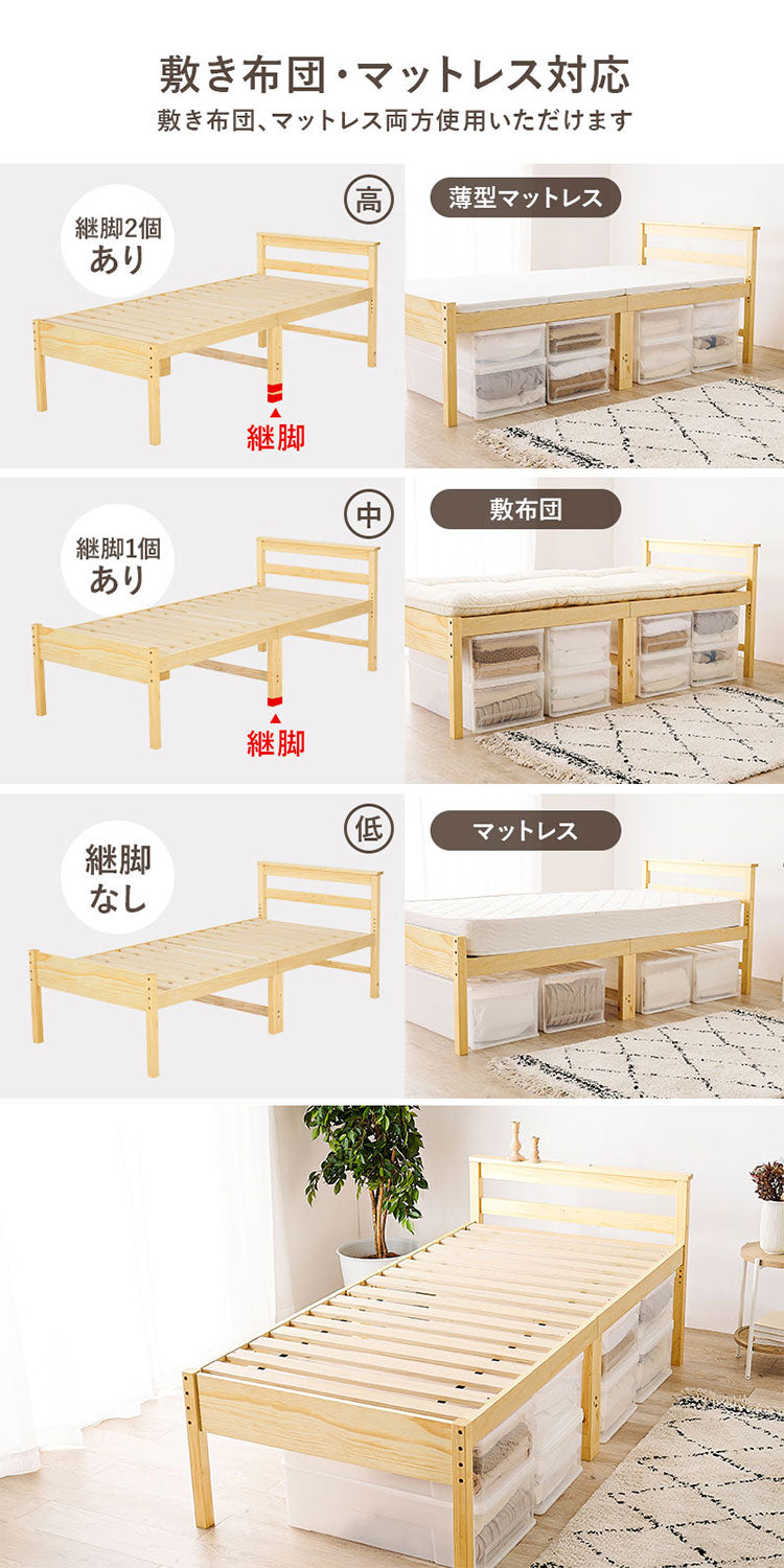 高さが調節でき、床面下が大容量の収納スペースに。頑丈なつくりの天然木すのこベッドです。