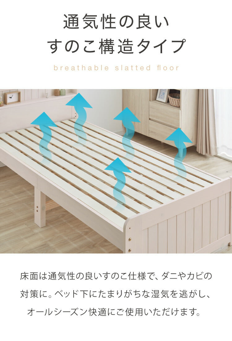高さ3段階 カントリー調 すのこベッド シングル 棚コンセント付き 耐荷重200kg 天然木 ベッドフレーム 棚付き 宮棚付き 宮付き 敷布団OK パイン材 白 ホワイト 可愛い かわいい ベッド下収納 北欧(代引不可)