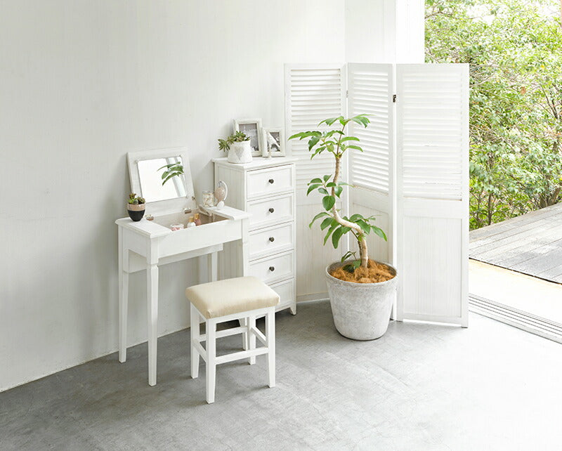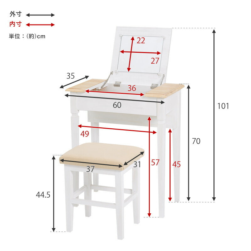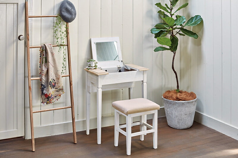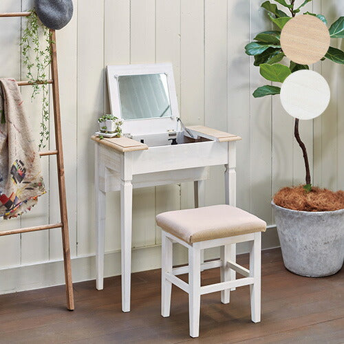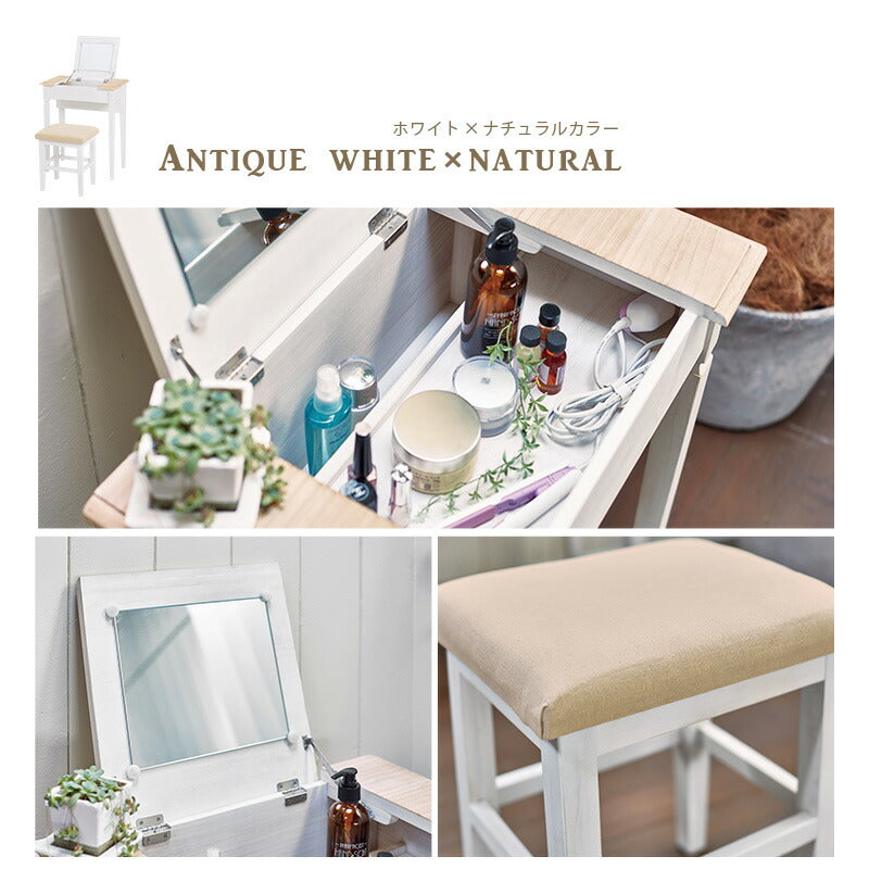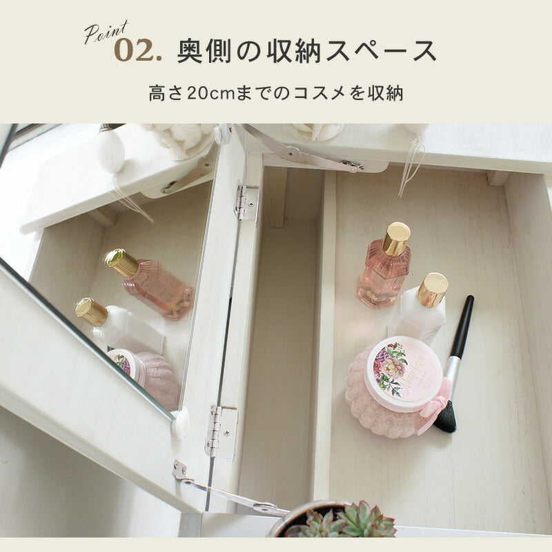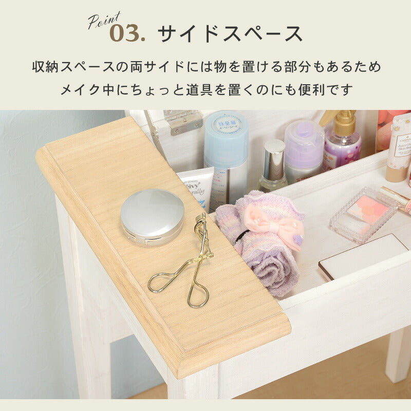 お化粧がしやすい大きなミラー、たっぷり入る収納スペース、お揃いのスツール付き。