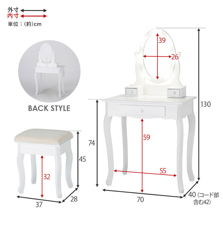 ドレッサー:(約)幅70×奥行42×高さ130cm、スツール:(約)幅37×奥行28×高さ45cm