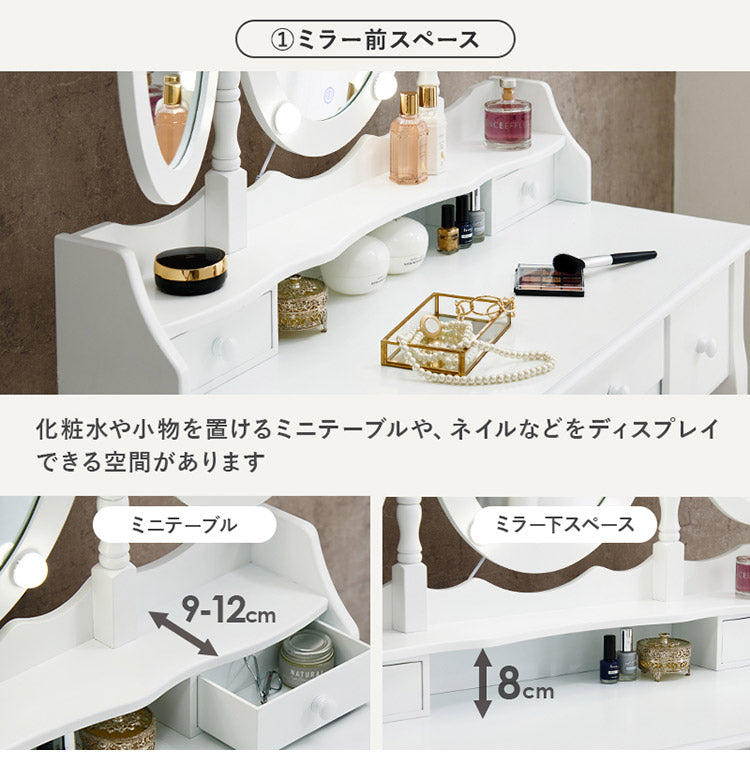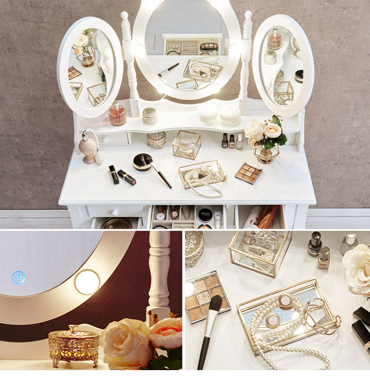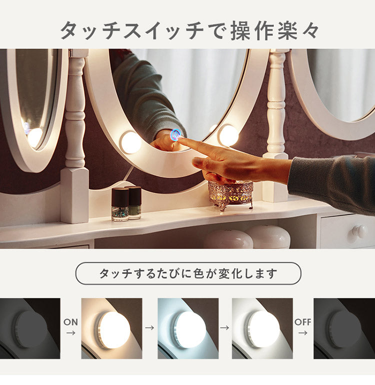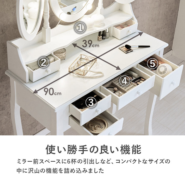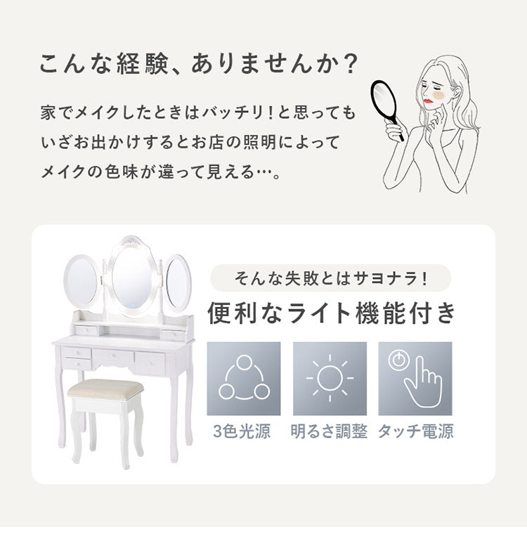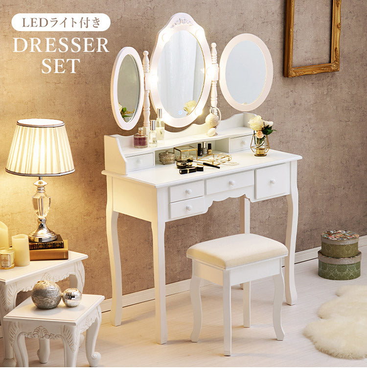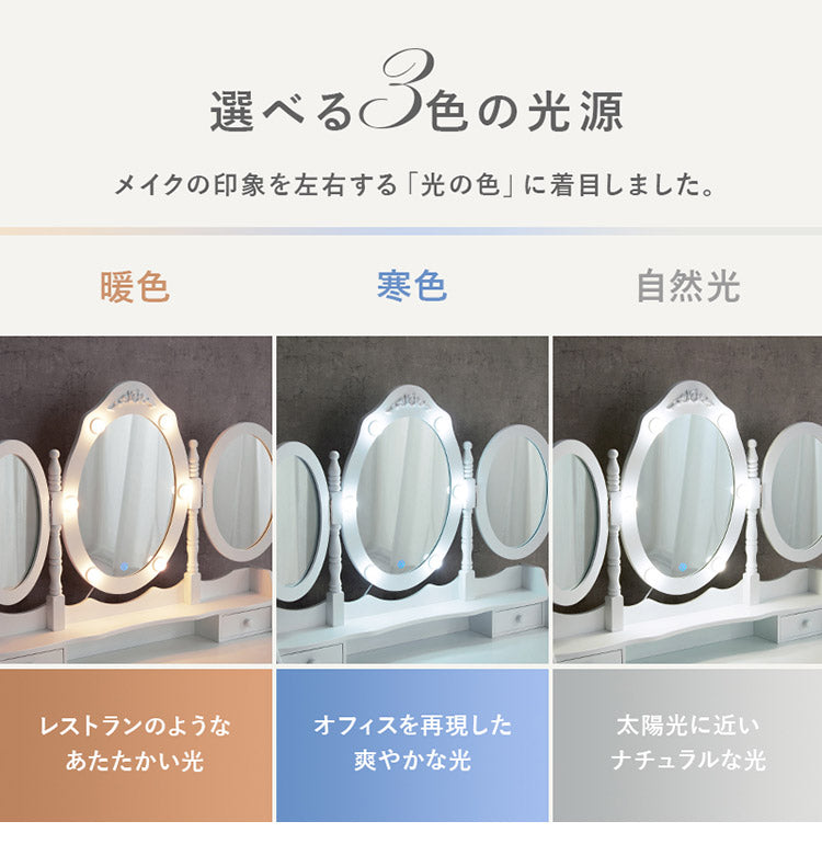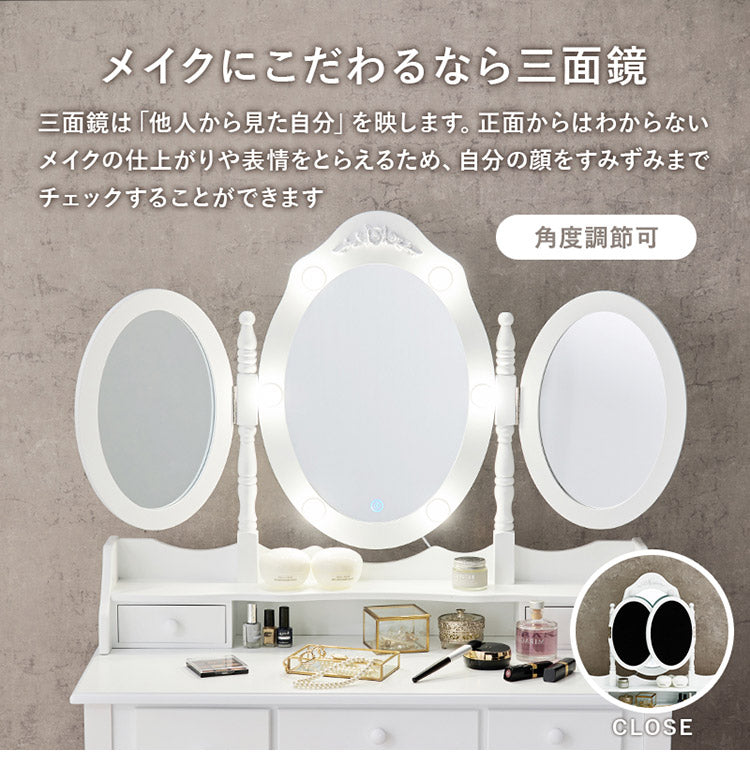 LEDの女優ライト付きのドレッサー。いろいろな角度からメイクやヘアスタイルを確認できる楕円形の三面鏡タイプ。上品な曲線脚のデザインを合わせたスツール付き