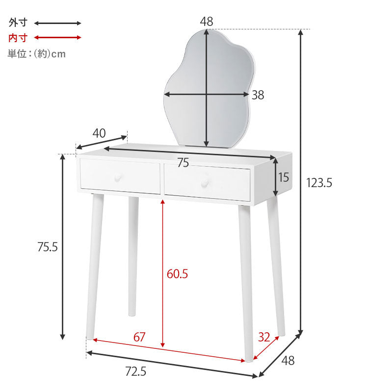 ドレッサー:(約)幅75×奥行48×高さ123.5cm、スツール:(約)幅36×奥行36×高さ45cm