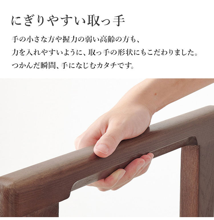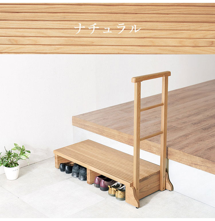 タモ材の木目が美しい、安心で便利な手すり付きの玄関踏み台。手すりを使って体を支えることでひざへの負担を減らし、段差の昇り降りが楽になります。