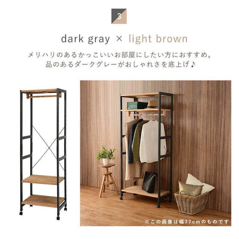 ハンガーと棚板の高さが変えられる天然パイン材のハンガーラック。
