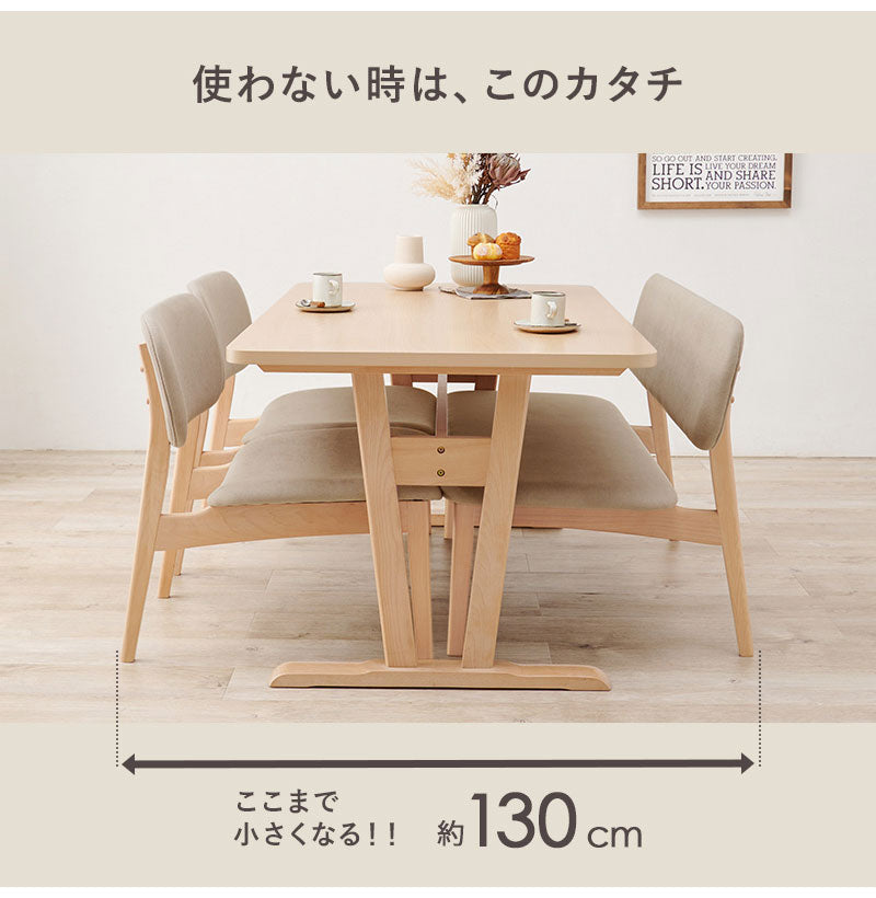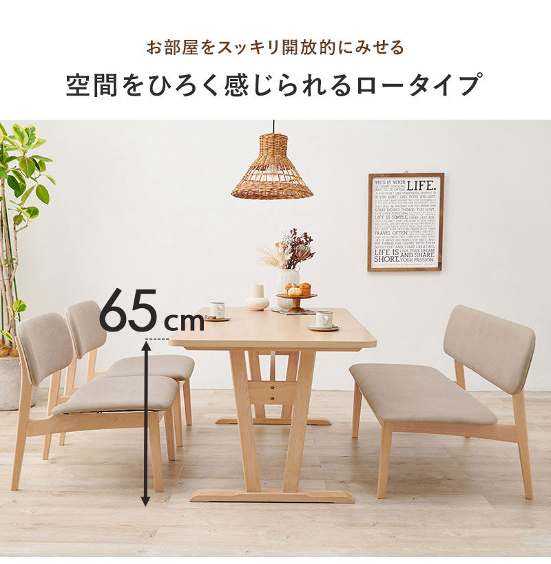 空間が広く感じられる低めのダイニングセット。なめらかな手触りの天然木を贅沢に使用しており、明るく繊細な木目を楽しめます。