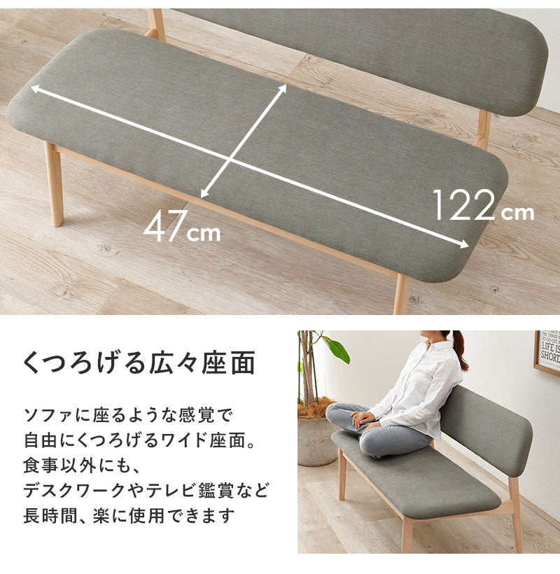 ダイニングベンチ 幅122 ゆったり座面 ロータイプ 背もたれ付き ベンチソファ 天然木 ビーチ材 ファブリック 椅子 イス リビング 可愛い かわいい シンプル 北欧 モダン おしゃれ(代引不可)