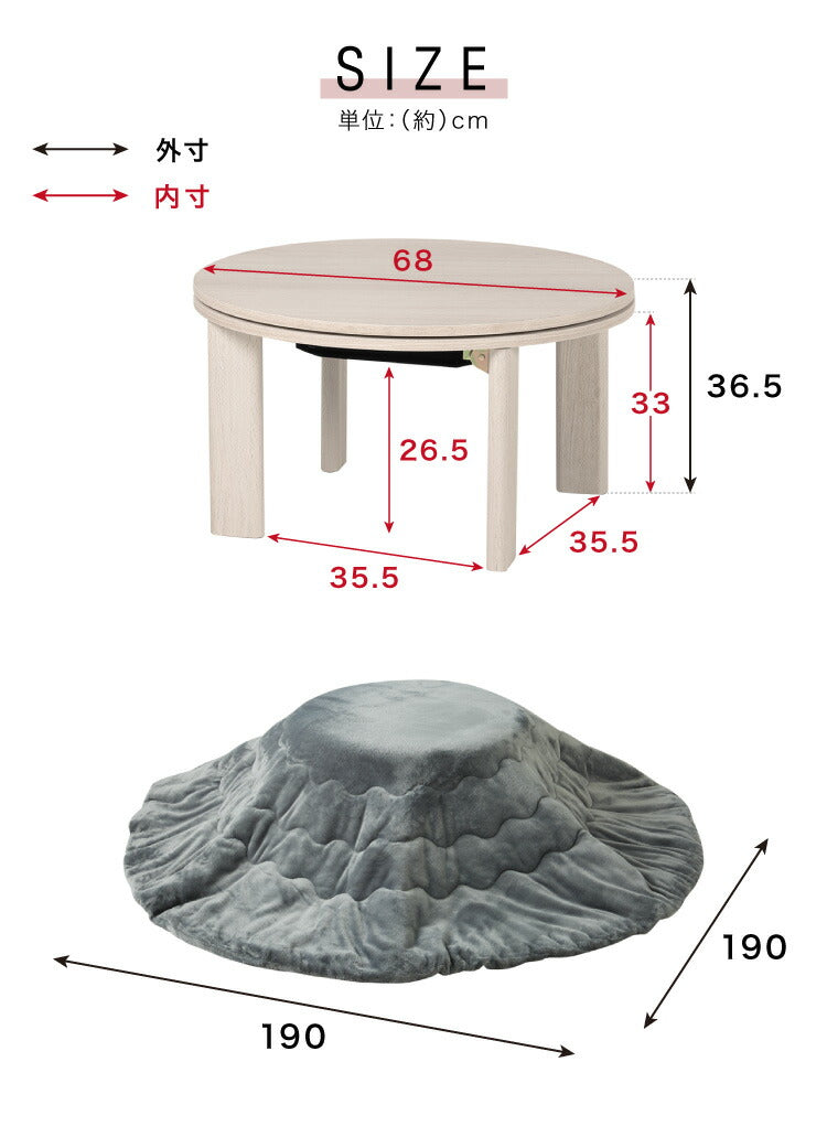 ※こたつテーブルのホワイトは、グレーの混ざった色味のため、混じりけのない真っ白ではありません。