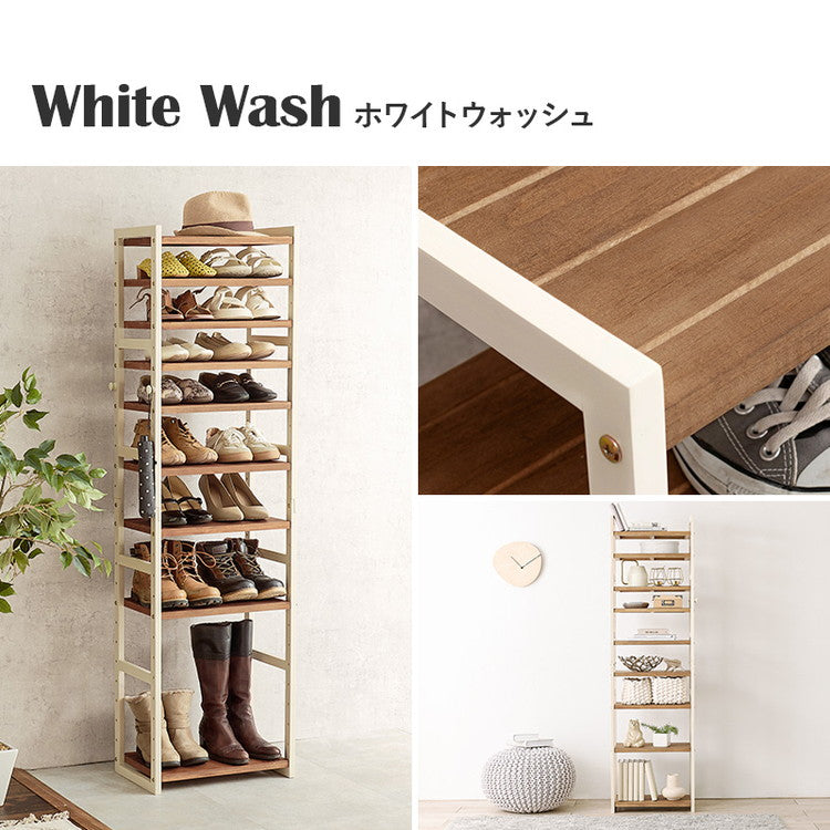 サンダルからブーツまで、靴の高さに合わせて棚の高さを組み換えできるシューズラック。靴が見やすく取り出しやすいオープンタイプ。