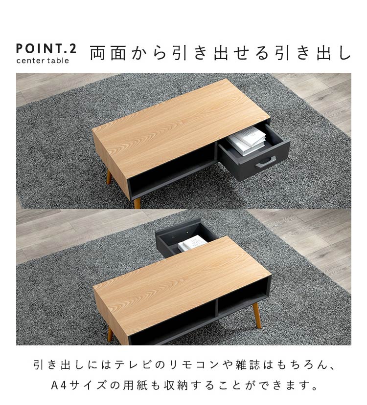 引き出しにはリモコンや雑誌、A4サイズの書類まで収納OK。デスクワーク用の机としても使えます。