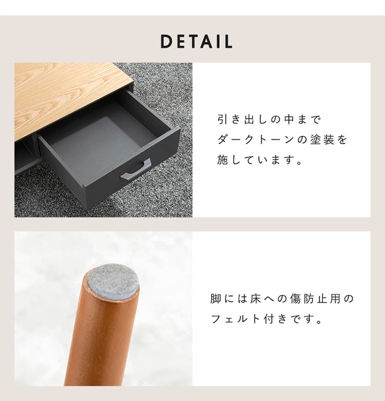引き出しにはリモコンや雑誌、A4サイズの書類まで収納OK。デスクワーク用の机としても使えます。