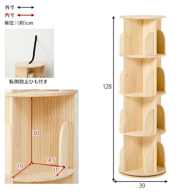 360度回転 天然木 本棚 幅39cm 4段 シェルフ 回転式 ラック 無塗装パイン材 棚 丸型 書棚 省スペース コーナーラック(代引不可)
