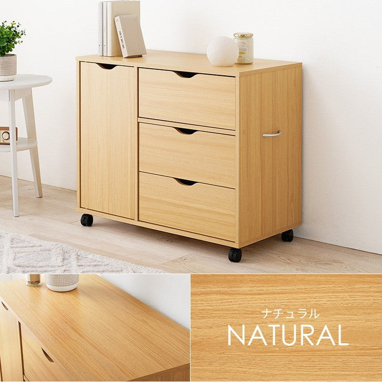 スッキリとしたデザインで移動に便利なキャスター付き。たっぷり収納できる引き出しと出し入れしやすい扉収納タイプ。