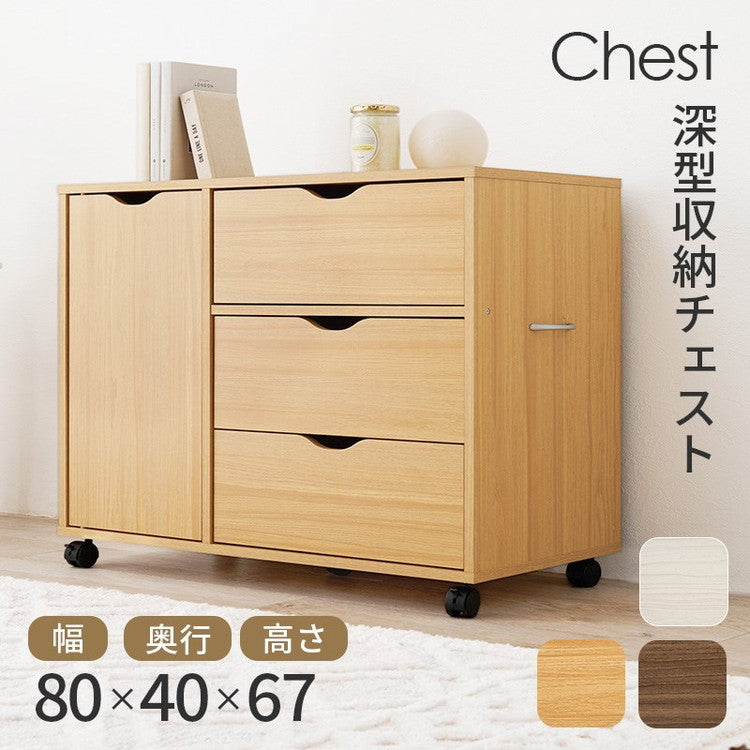 深型収納チェスト キャスター付き 北欧 幅80 奥行40 高さ67 3段 チェスト 扉収納 引き出し 引出し リビングチェスト リビングボード リビング収納 棚 ラック ナチュラル おしゃれ(代引不可)