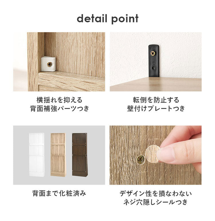 1cmピッチで棚板高さが調節できるハイタイプの大容量本棚。下に行くほど奥行が広くなっており、引出しには日用品の収納もできます。