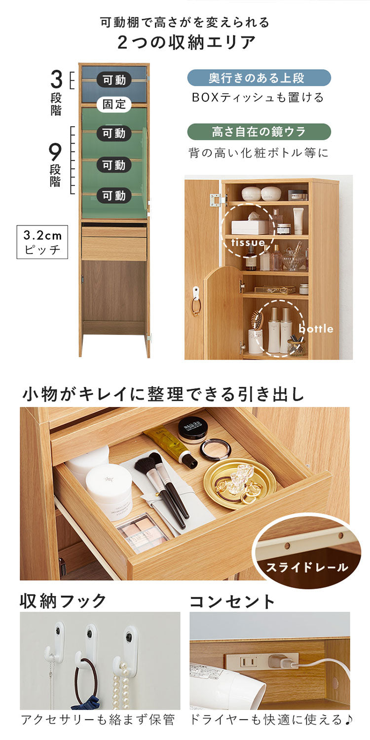 姿見 ドレッサー スツール付き 2口コンセント 幅39cm スリム×大容量 省スペース 姿見ドレッサー 白 ホワイト ミラー 省スペース デスクドレッサー デスク 机 テーブル(代引不可)