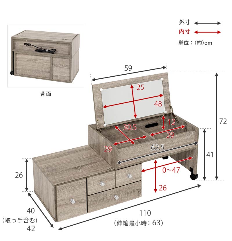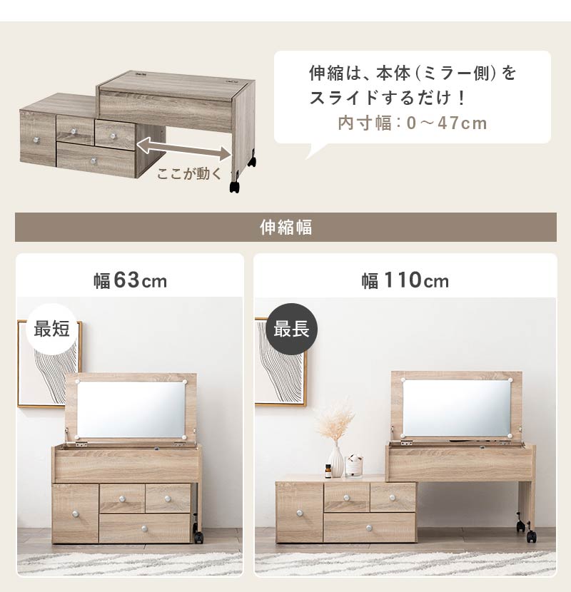 伸縮ドレッサー ロータイプ かわいい 幅63~110 コンセント付き 伸縮式 ロードレッサー 化粧台 鏡台 引き出し 収納 コスメボックス メイクボックス 大容量 姫系 おしゃれ(代引不可)