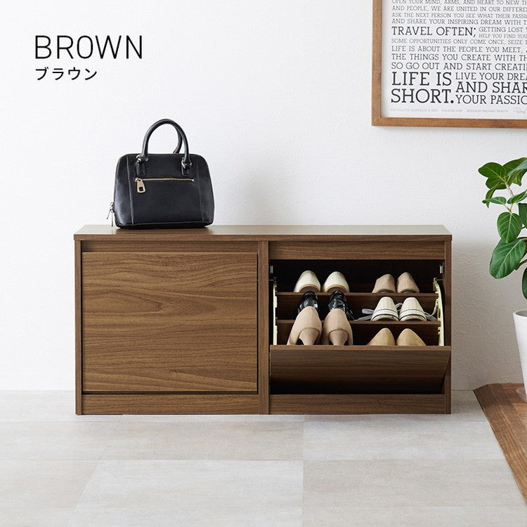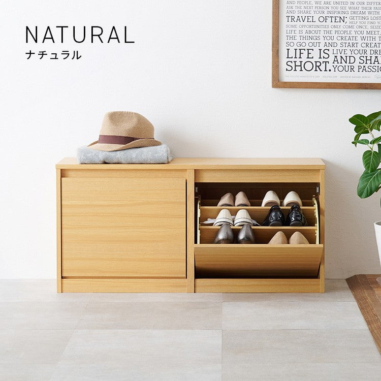 フラップ式のシューズラック機能を備えた玄関ベンチ。奥行スリムで圧迫感がなく、スッキリとしたデザインです。