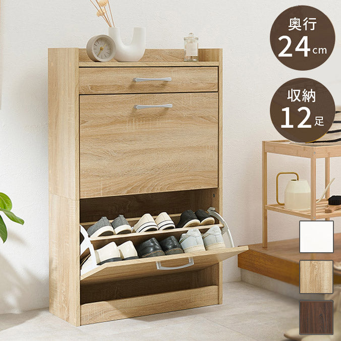 シューズラック 奥行24cm スリム 2段 最大12足収納 すっきり隠せる フラップ扉 玄関収納 引き出し付き シューズボックス 靴箱 下駄箱 スリムラック おしゃれ(代引不可)