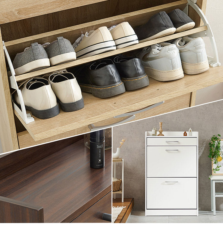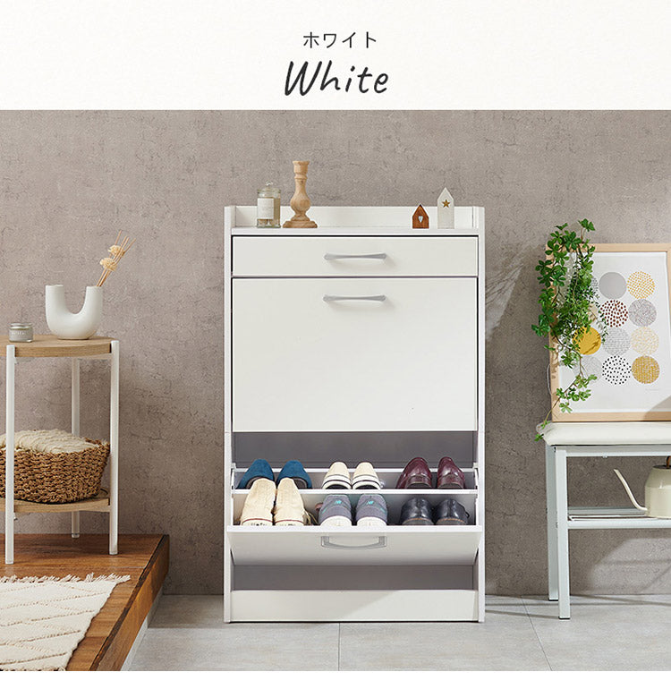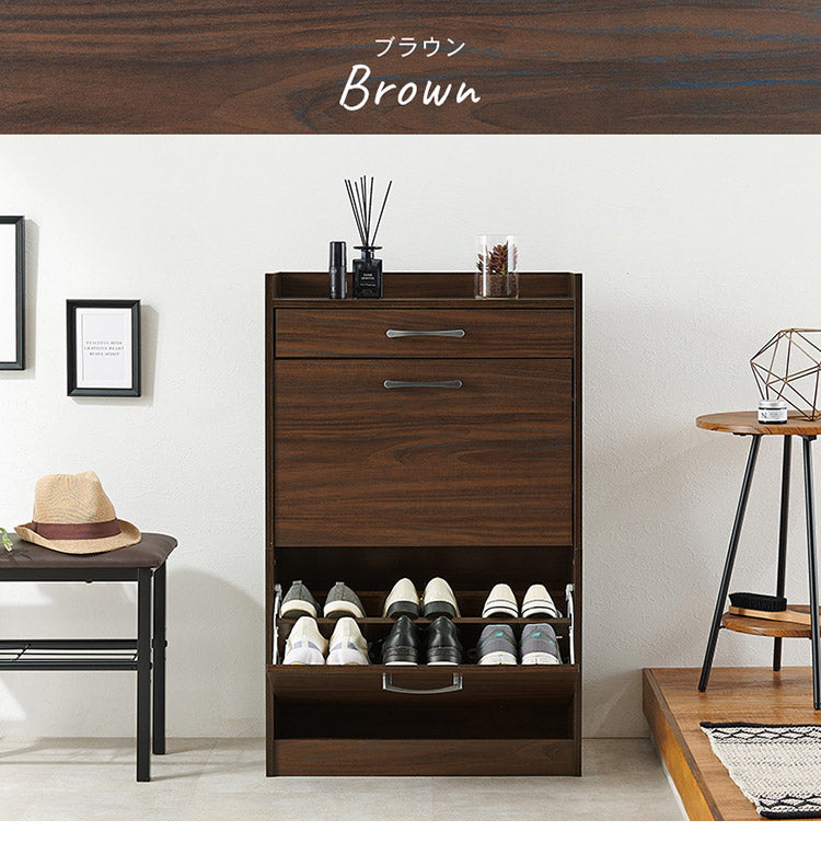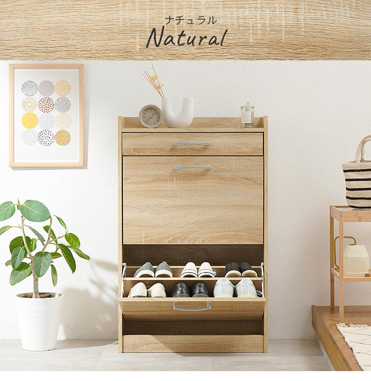 フラップ扉式で奥行スリムなのに大容量収納タイプです。引出し付きで靴のお手入れ道具や玄関小物を収納可能