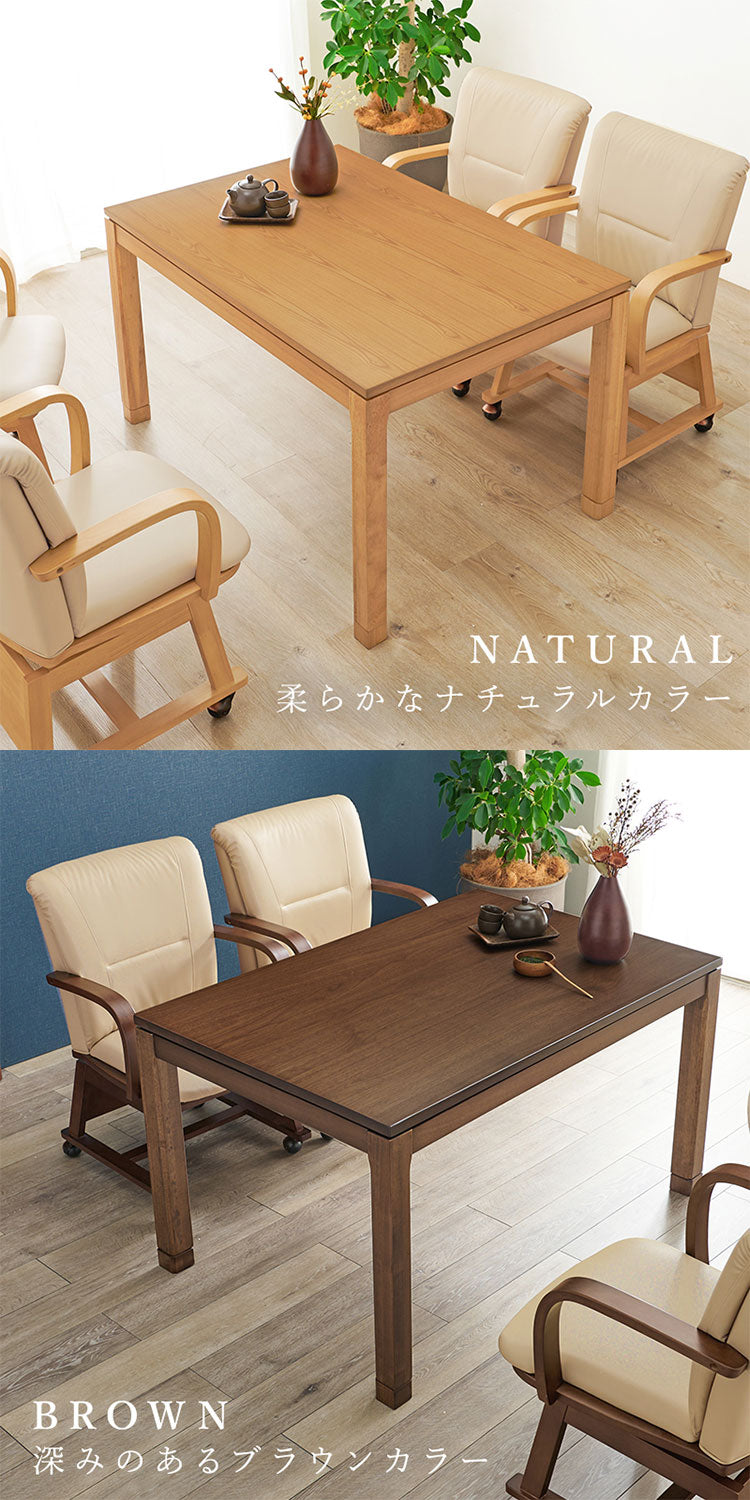 天然木のぬくもりを感じられるダイニングこたつテーブル。5cmの継脚付きで椅子に合わせて高さを変えられます。