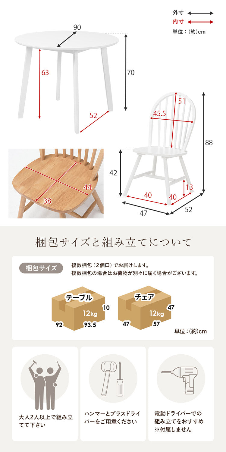 テーブル:(約)幅90×奥行90×高さ70cm、チェア:(約)幅47×奥行52×高さ88×座面高42cm