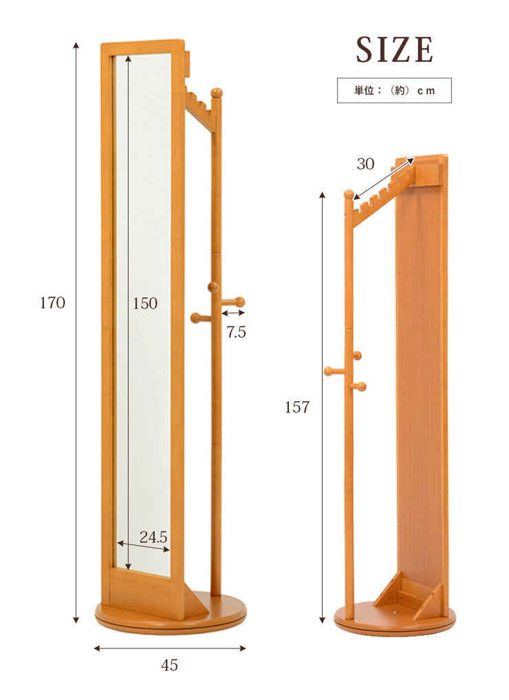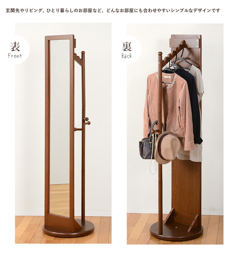 ミラーとハンガーが一緒になった省スペース仕様。回転するので服を取ってすぐに鏡で確認できます。