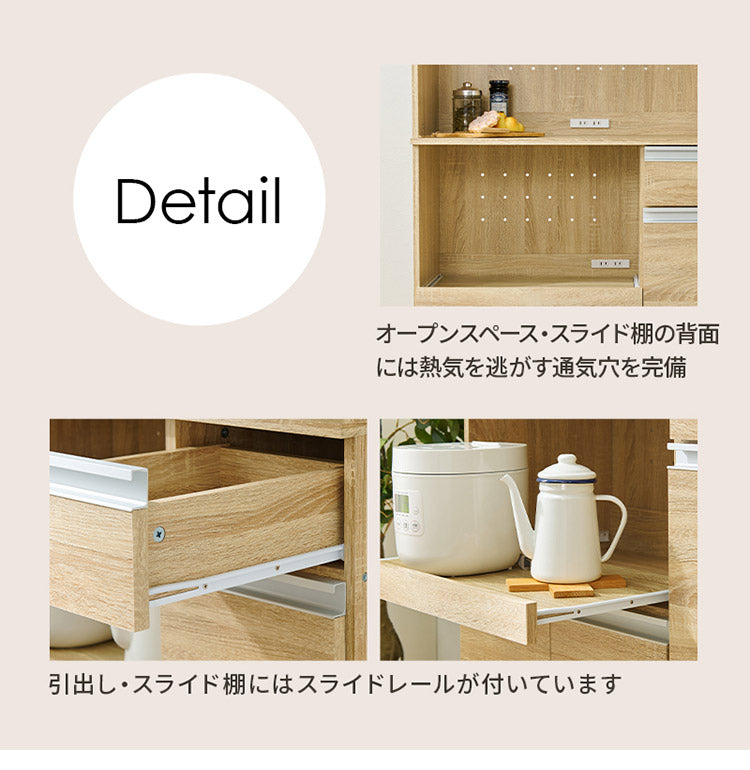 主材:プリント紙化粧パーティクルボード、天板・スライド棚:合成樹脂化粧パーティクルボード、取手:スチール