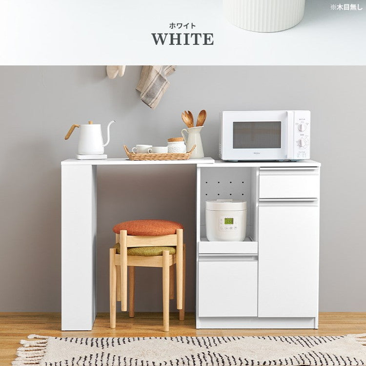 お部屋の広さや収納するものに合わせて幅を調整できるカウンターキャビネット。食器や調理器具、キッチン家電などがスッキリ片付きます。