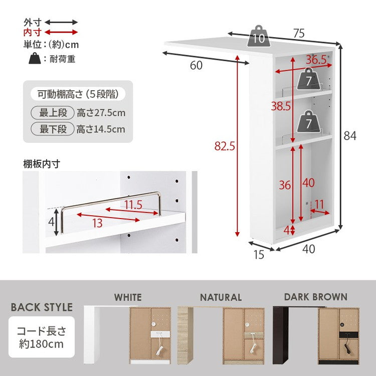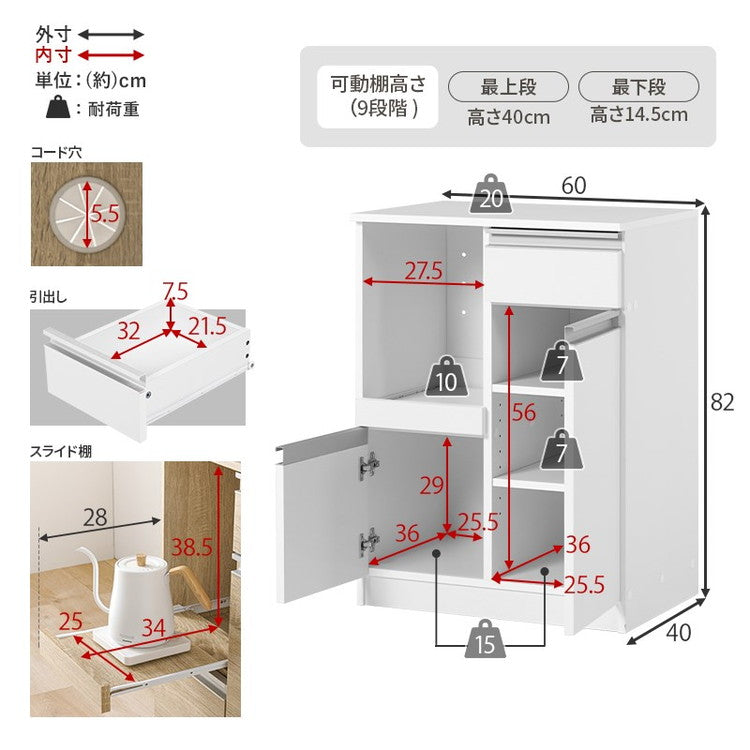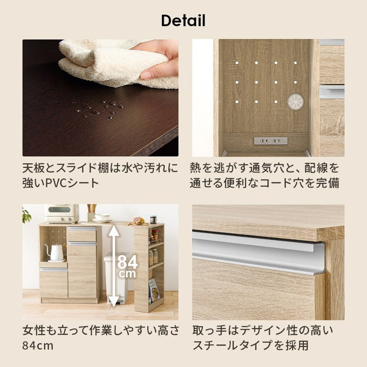 主材:プリント紙化粧パーティクルボード、天板・スライド棚:合成樹脂化粧パーティクルボード、取手:スチール
