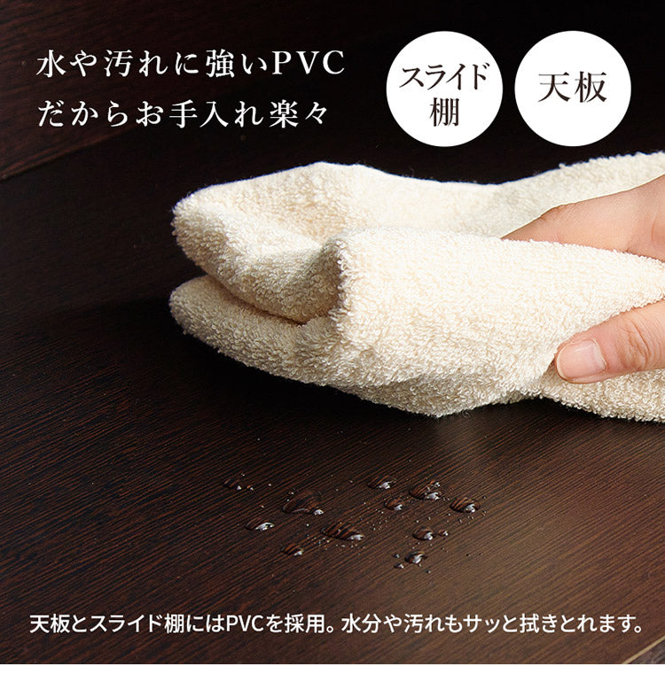 主材:プリント紙化粧パーティクルボード、天板・スライド棚:合成樹脂化粧パーティクルボード、取手:スチール