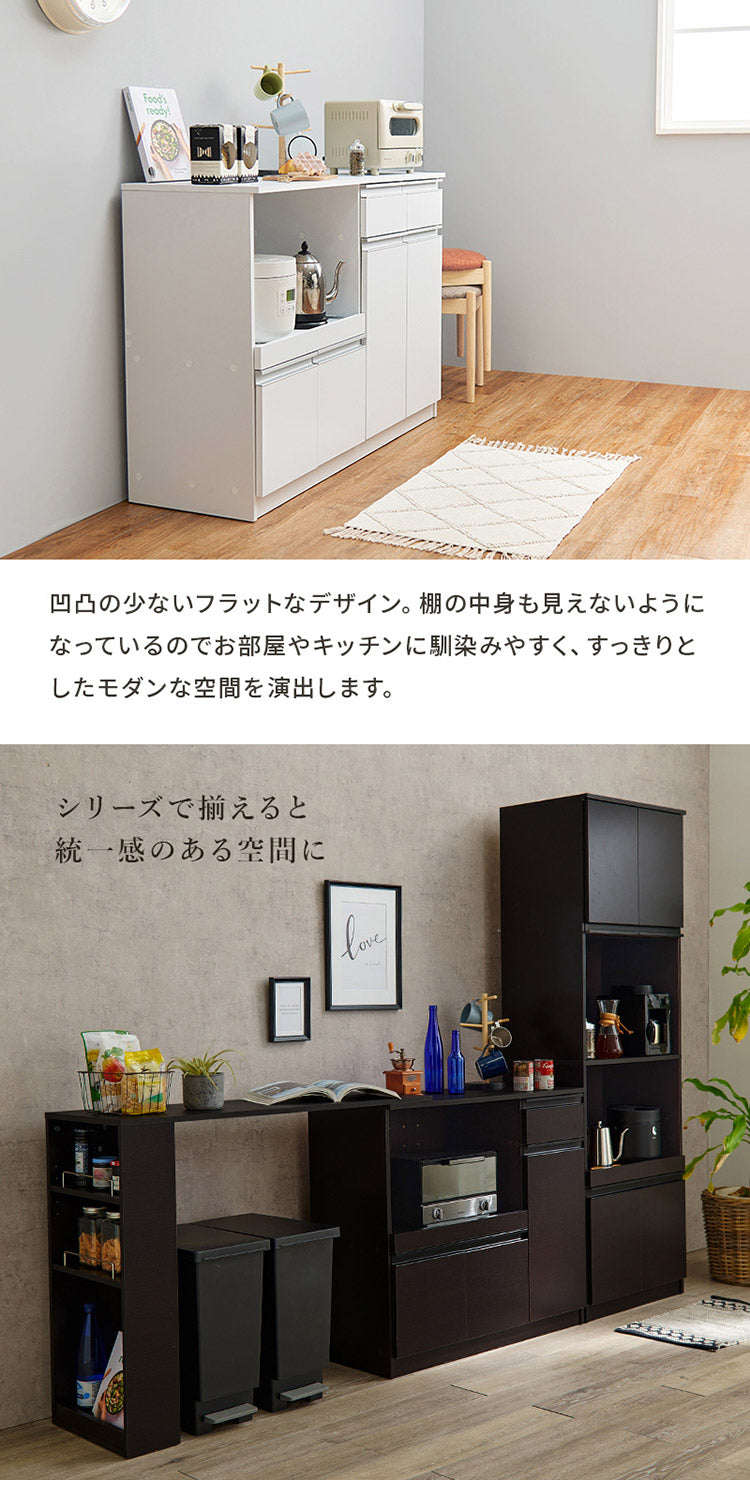 立って作業がしやすい天板高さのカウンターキャビネット。食器や調理器具、キッチン家電がスッキリ片付く大容量収納です。