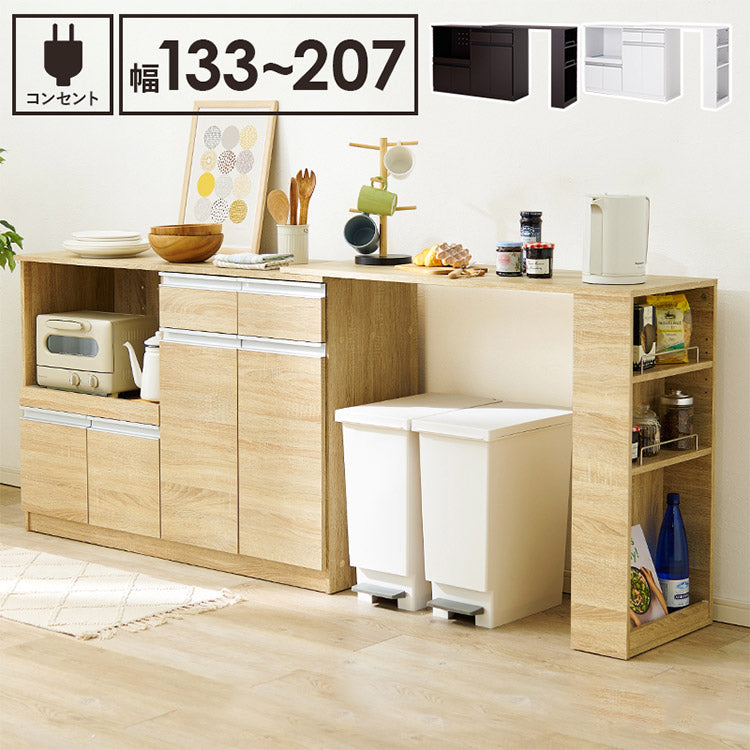 伸縮キッチンカウンター 2点セット 幅133~207 2口コンセント スライド棚 引出し 扉収納 キッチン収納 キャビネット 食器棚 レンジ台 レンジボード ごみ箱上ラック ゴミ箱上ラック おしゃれ(代引不可)