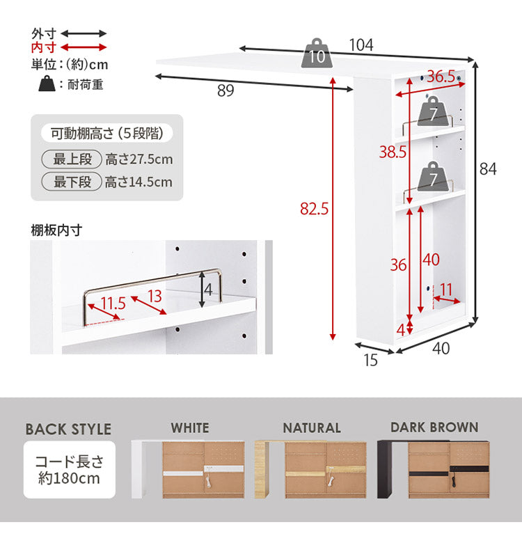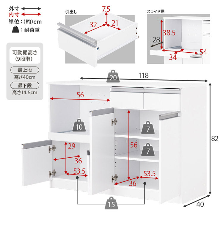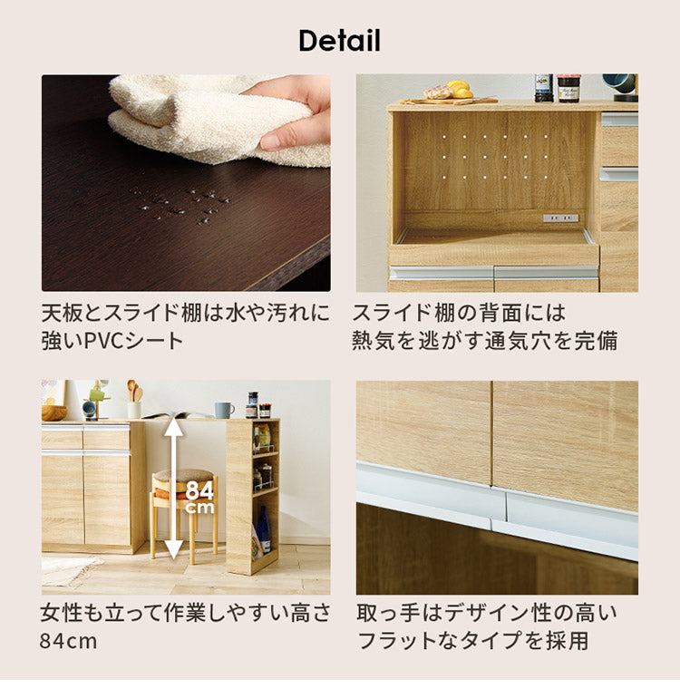主材:プリント紙化粧パーティクルボード、天板・スライド棚:合成樹脂化粧パーティクルボード、取手:スチール