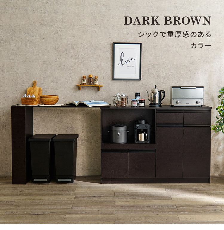 お部屋の広さや収納するものに合わせて幅を調整できるカウンターキャビネット。食器や調理器具、キッチン家電などがスッキリ片付く大容量収納。